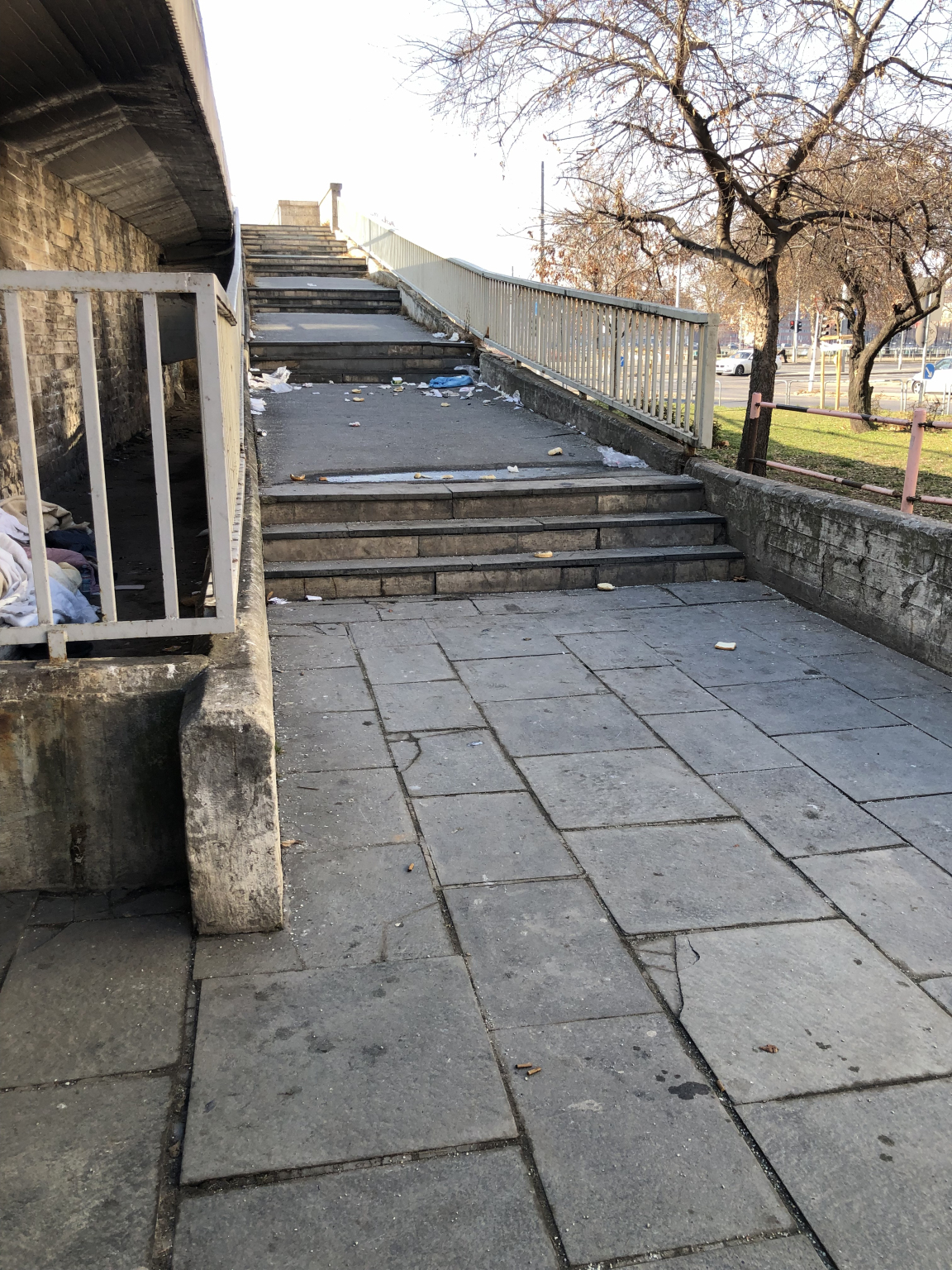 A Petőfi híd pesti hídfőjének északi oldalán nagyon szemetes a lépcső.