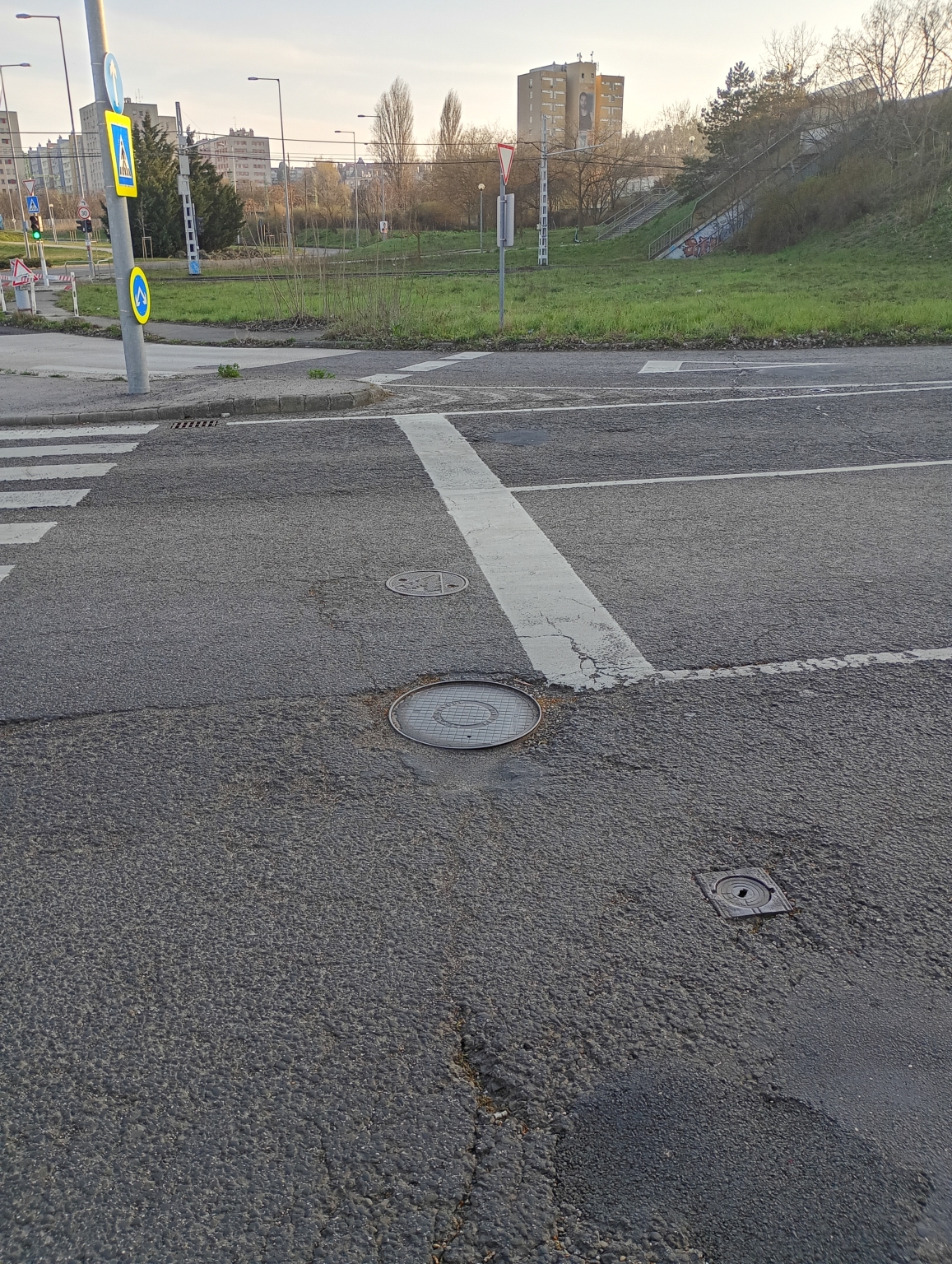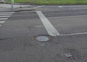 Kérem az illetékest, hogy a képen látható aknafedél környezetét aszfaltozzák újra, illetve hozzák szintbe az úttal!