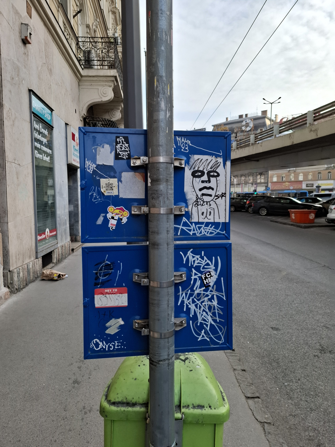 A képeken látható módon össze van firkálva, matricázva a tábla.