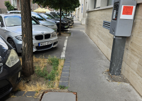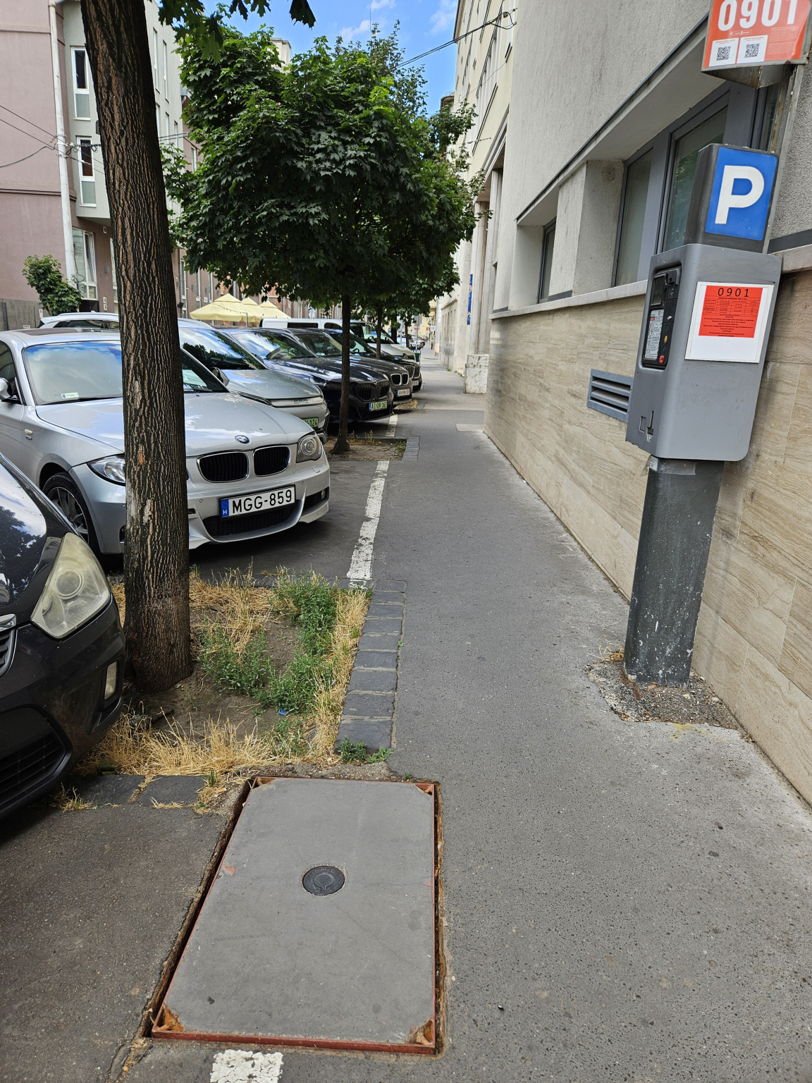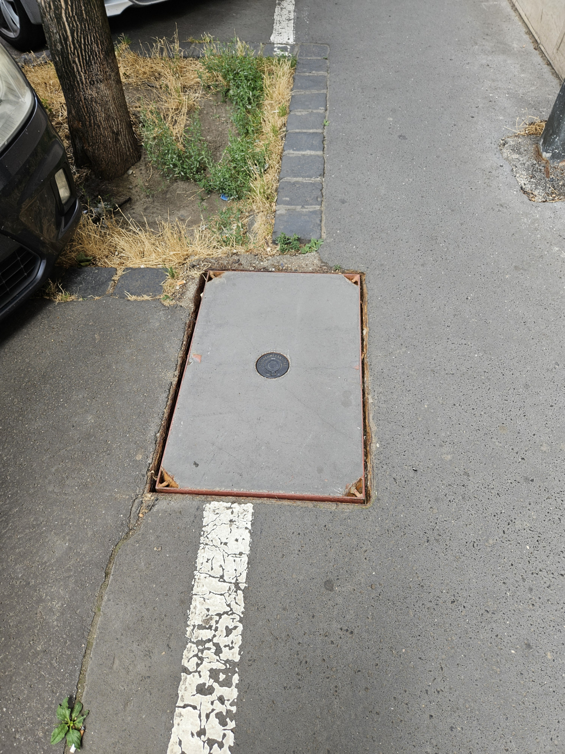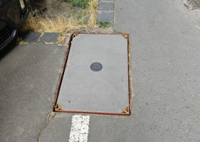 A Közraktár utcában a Kollégium és Iskola között a parkoló óránál található kisméretű fedlap darabos.