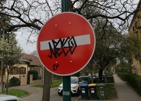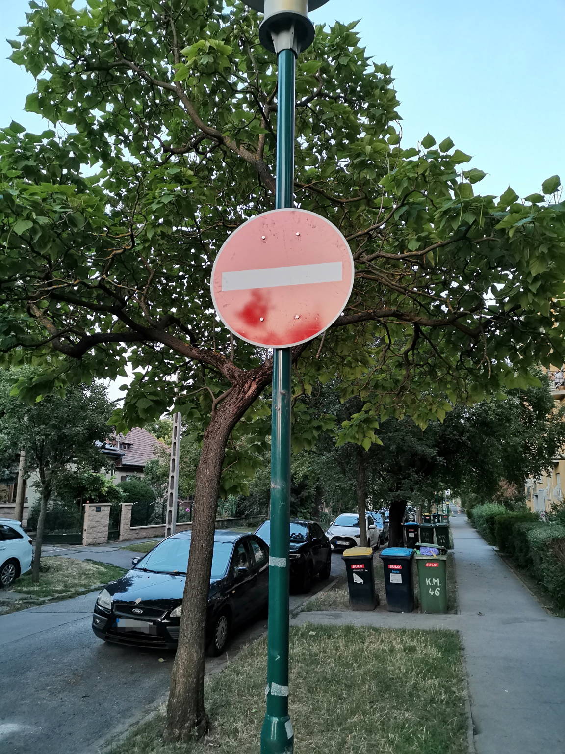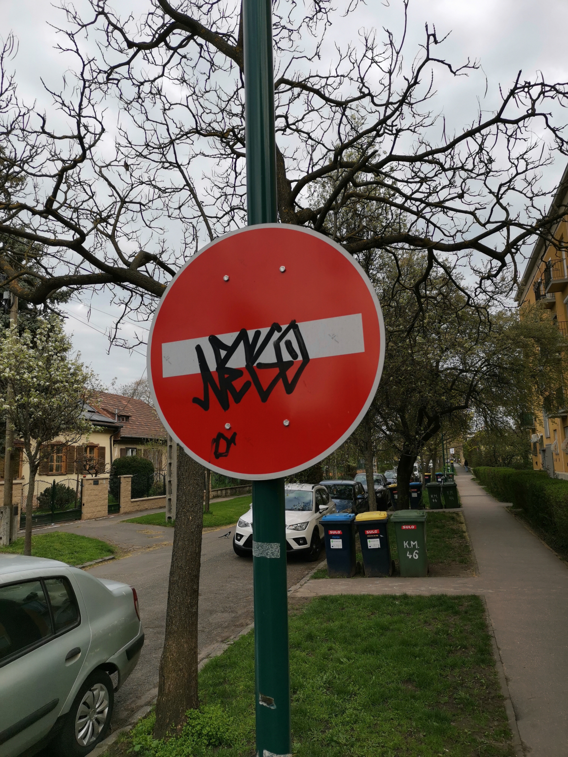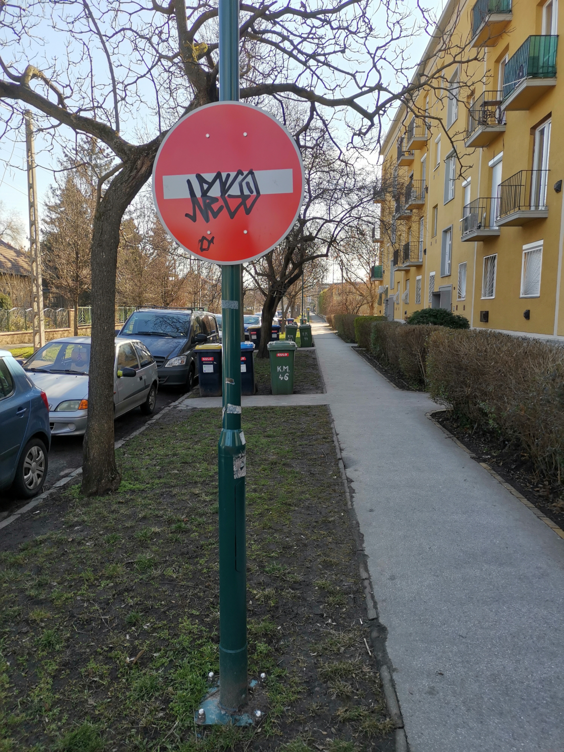 A Kaffka Margit utca 46. szám előtt, a park becsatlakozó útjánál a behajtani tilos táblát összefirkálták. Kérem az illetékest a tábla megtisztítására vagy cseréjére.