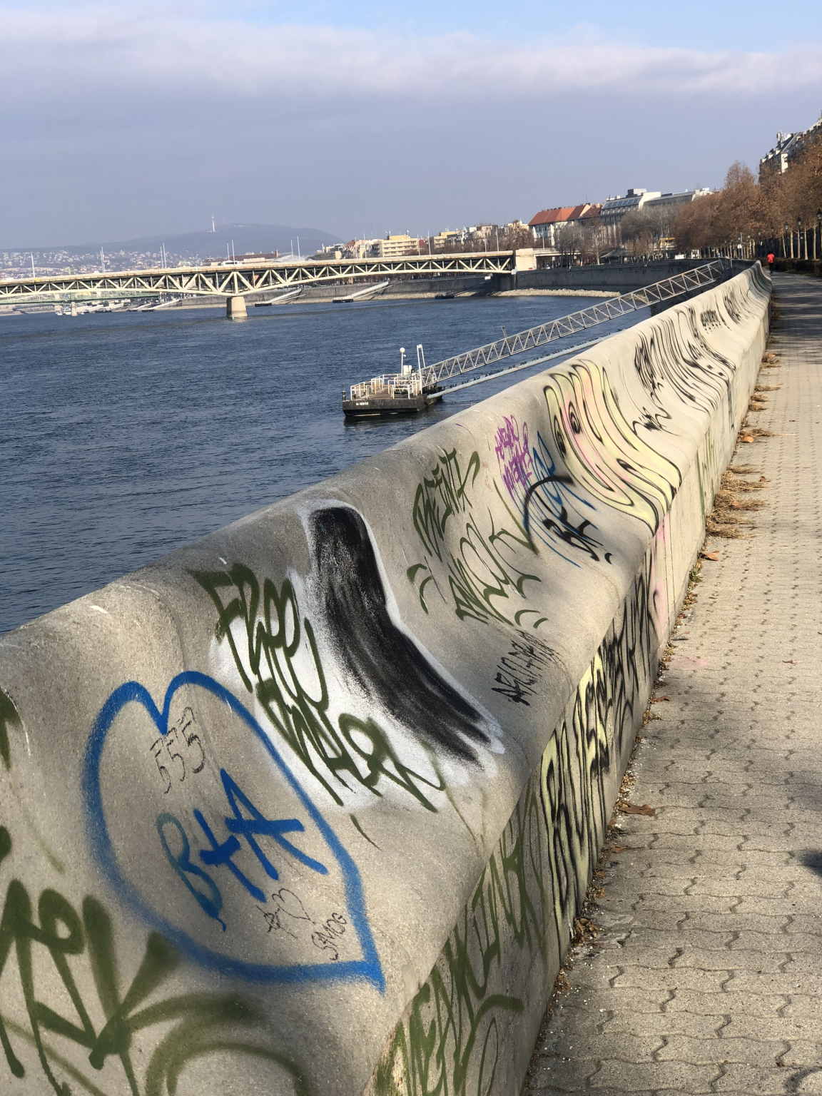 A gátat szétgraffitizték, a Nemzeti Színháztól egészen a Petőfi hídig.