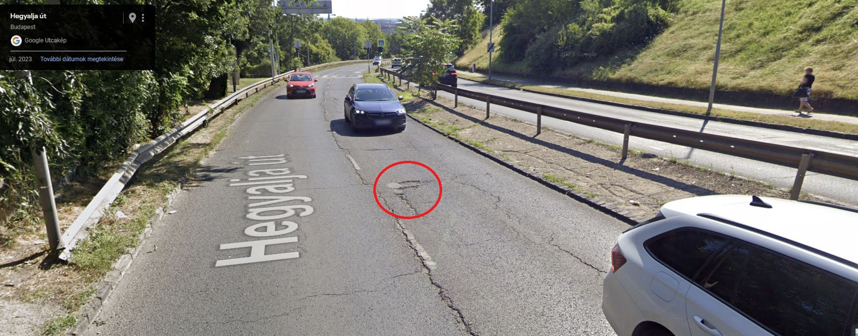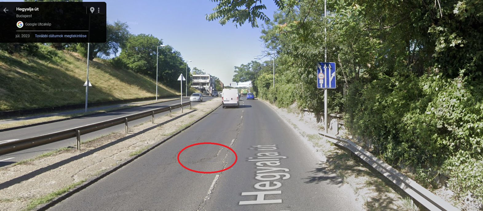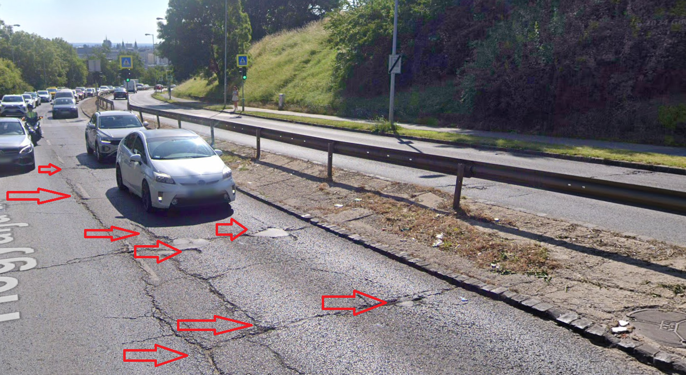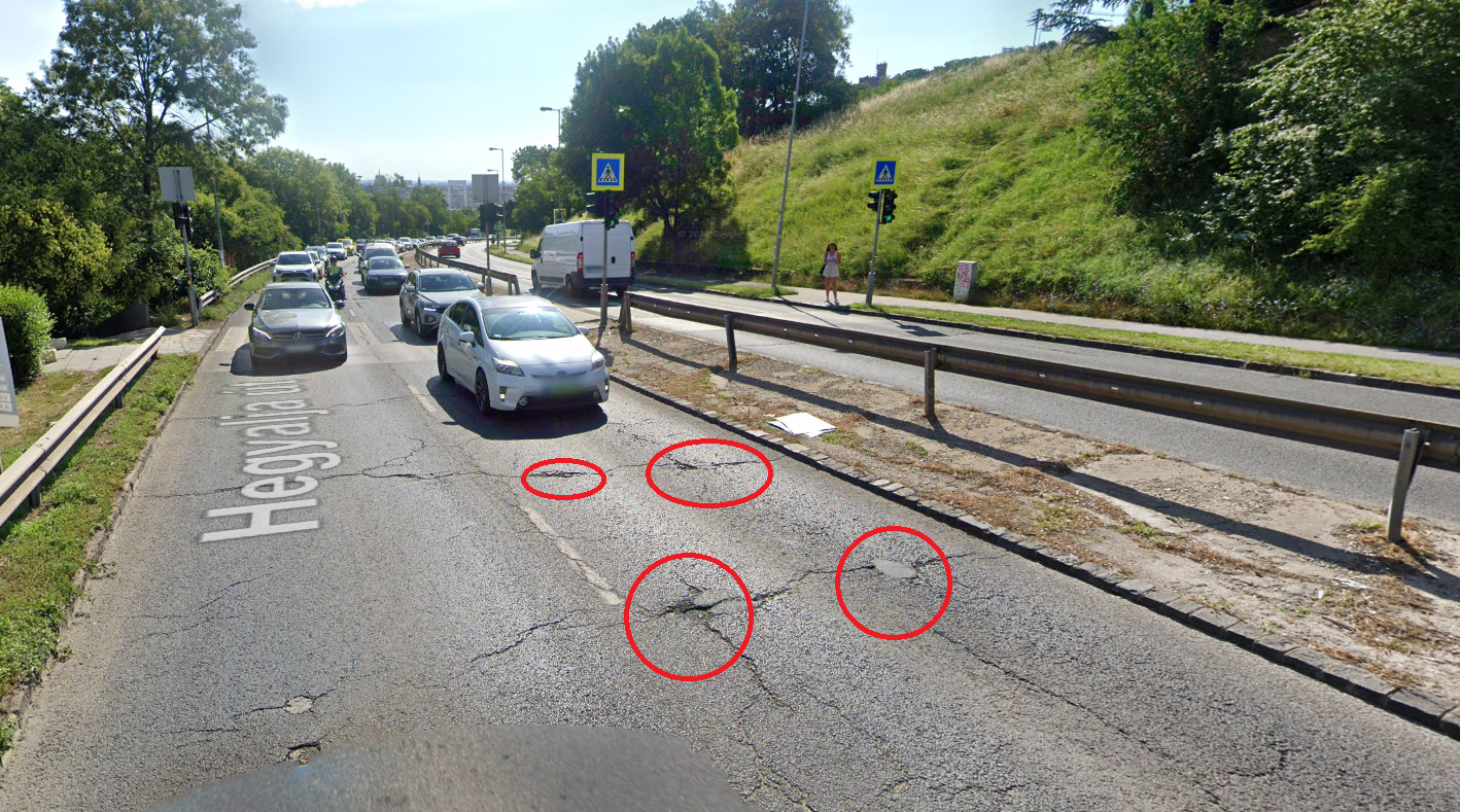 A Hegyalja út Buda fele vezető részén tele van kátyúkkal, bemélyedt csatornafedelekkel, bukkanókkal, bemélyedésekkel. A belső sáv katasztrófa, de a jobb oldali sáv is súlyosan érintett.