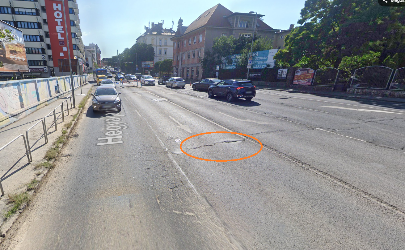 Hosszában repedt szét a sáv a Hegyalja út-Mészáros utca kereszteződésében! Ismétlem: _hosszában_ repedt szét, tehát nem a kátyút kellene befoltozni, hanem a hosszanti, teljes sávot átölelő repedést kellene megszüntetni!!