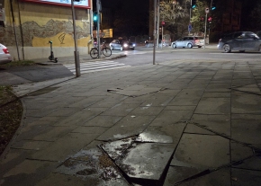 A Maros utca 50 előtt lévő UPC feliratú fedlap kerete kikopott.