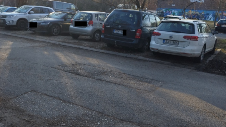 Tavaly lejárt műszakis autó leeresztett kerékkel áll a Gimnázium és a Park között.
