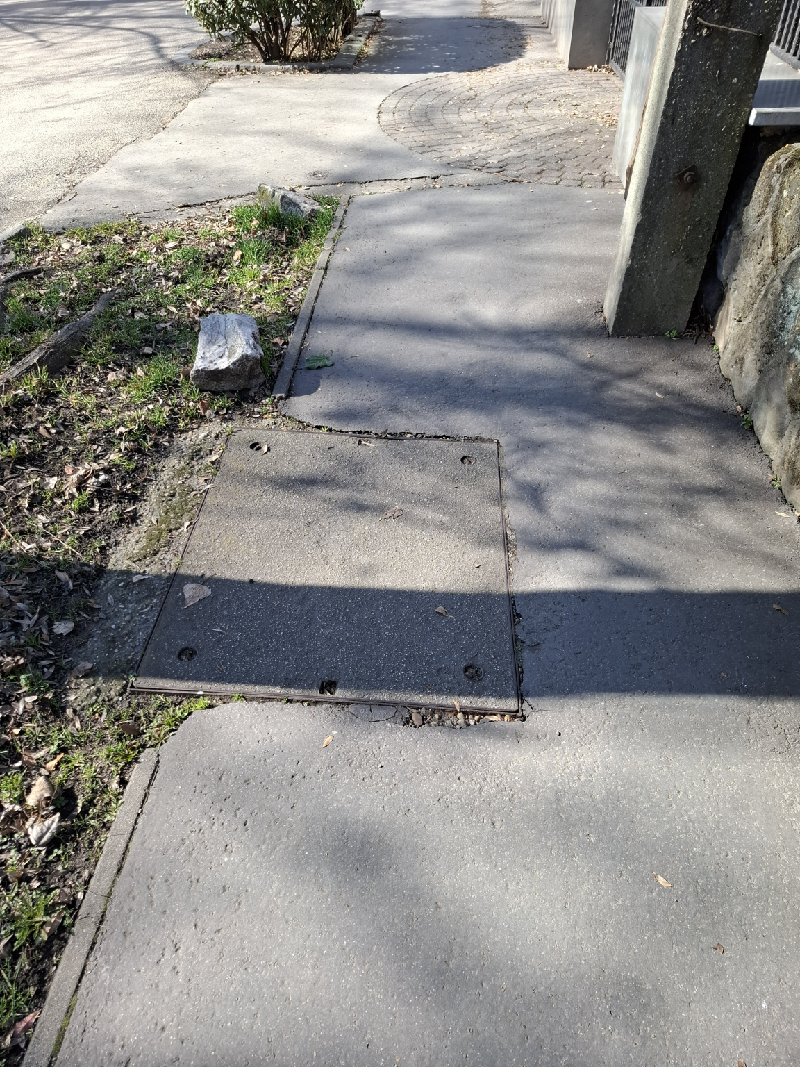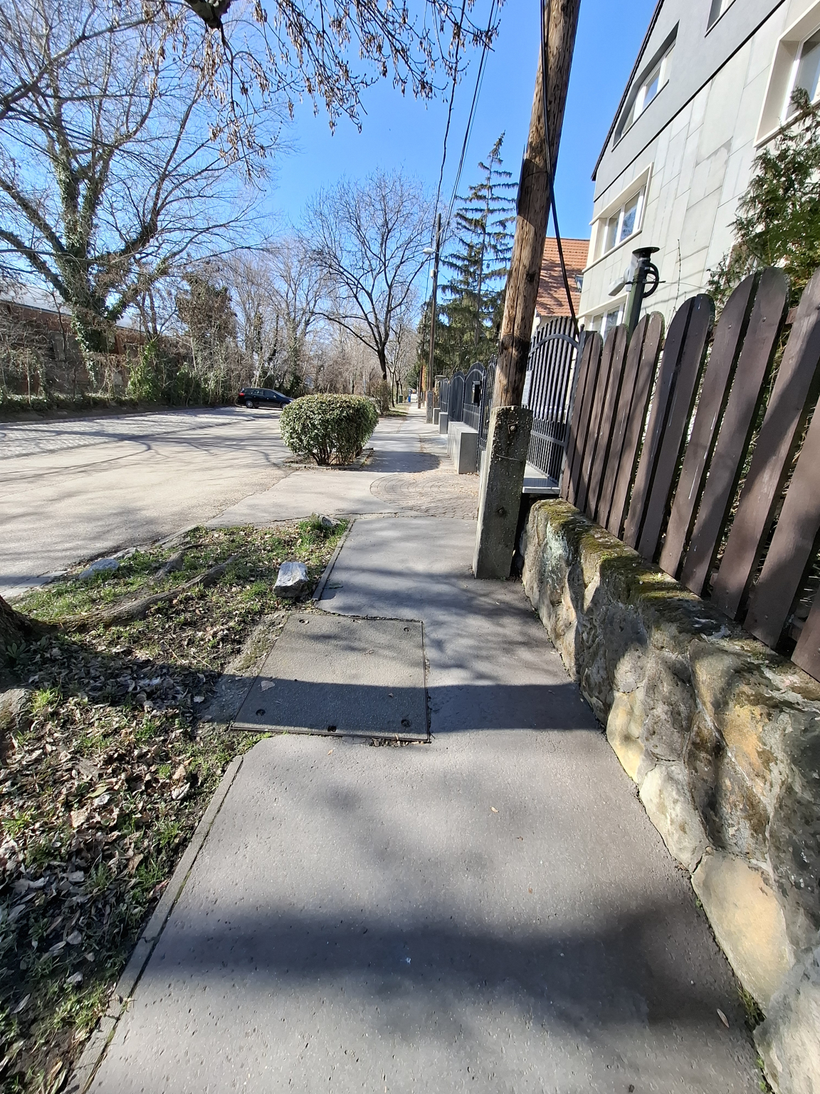 A Major utca 59 előtti járdán a fedlap megsüllyedt, eltörte a járda szélét is.