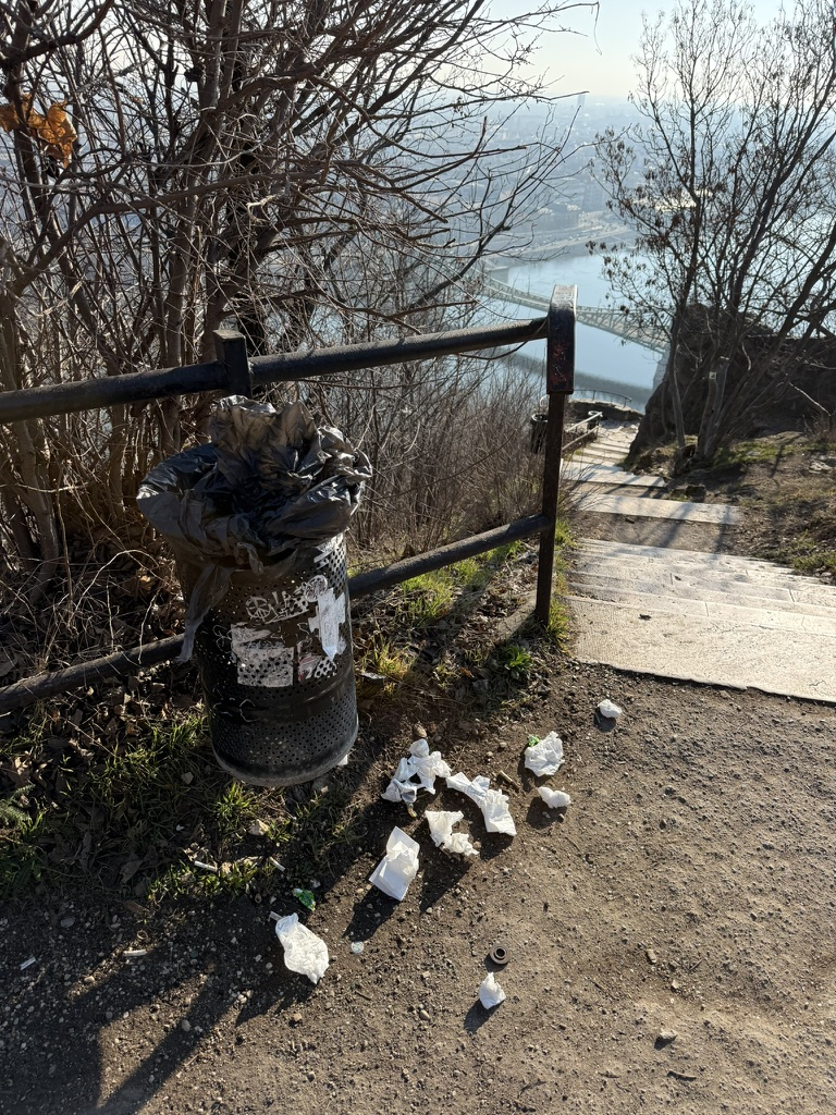 A problémát 2018-ban majd 2020-ban és 2024-ben már jelentettem, azóta kicseréltek pár szemetest, de a többségükkel még mindig probléma van. A nyitott szemetesekből a varjak élelem után kutatva kiszedik a szemetet. Ezért szemetes az egész Gellért-hegy. Javaslom "varjúbiztos" szemetesek felszerelését.