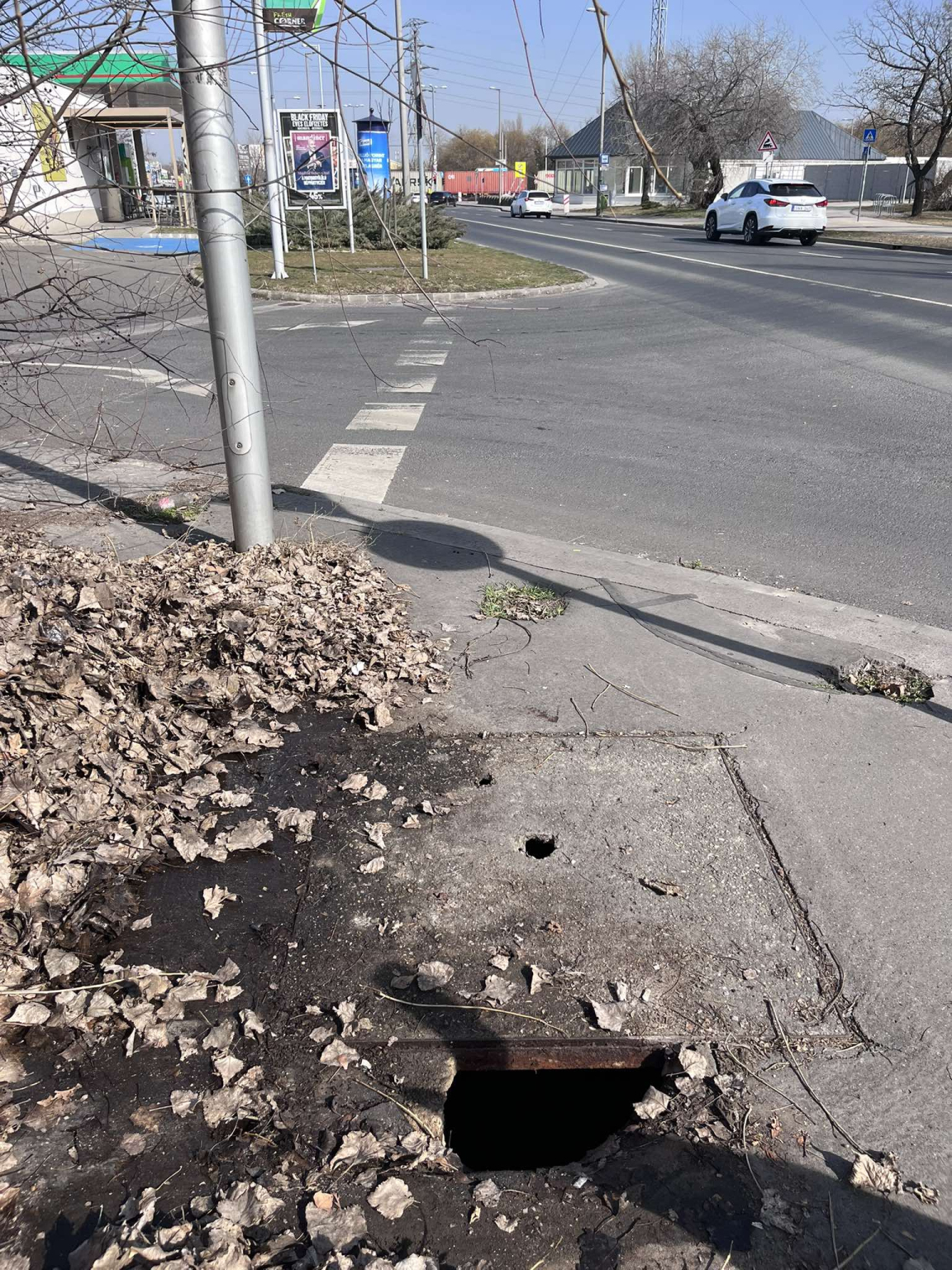 Beszakadt fedlap és mellette a járda is . BALESETVESZÉLYES !!!