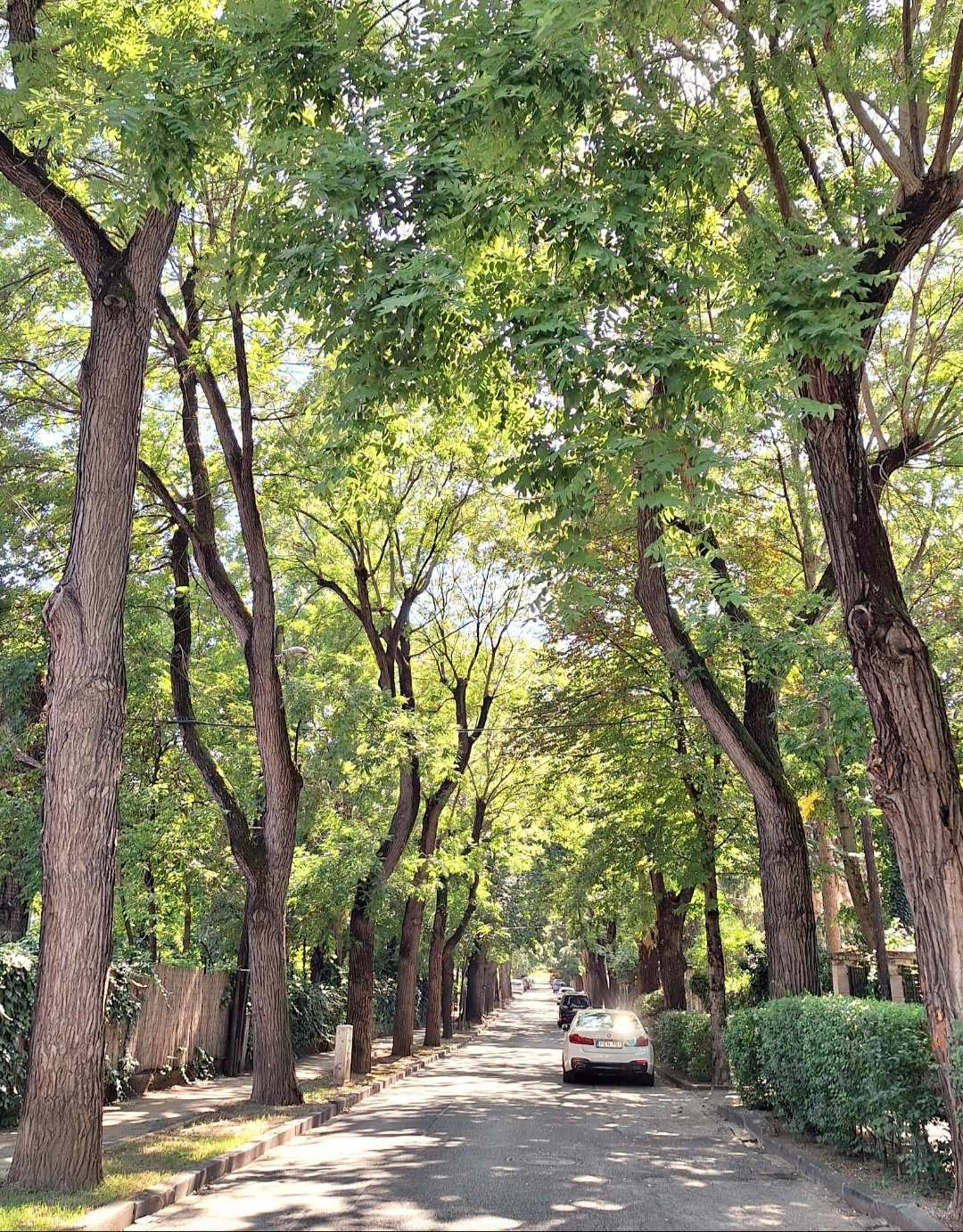 Az oldalsó ágak amik eltakarják a világítást, de főleg a fák teteje, lombkoronái ami annyira megnőttek, hogy már a szemben lévő fák tetejével összeérve, besötétítik az utcát.
