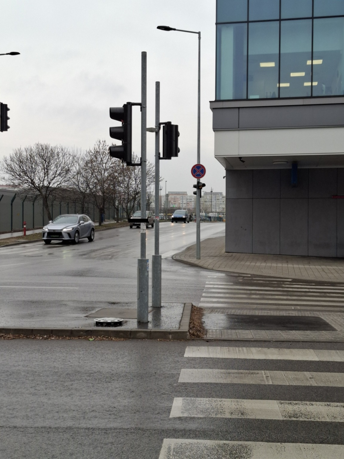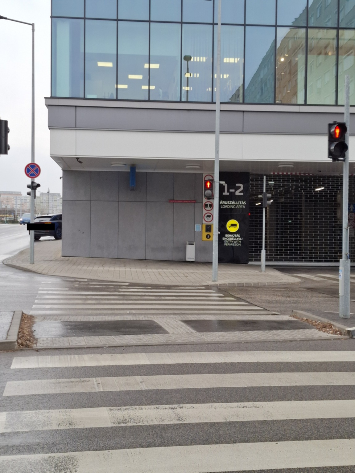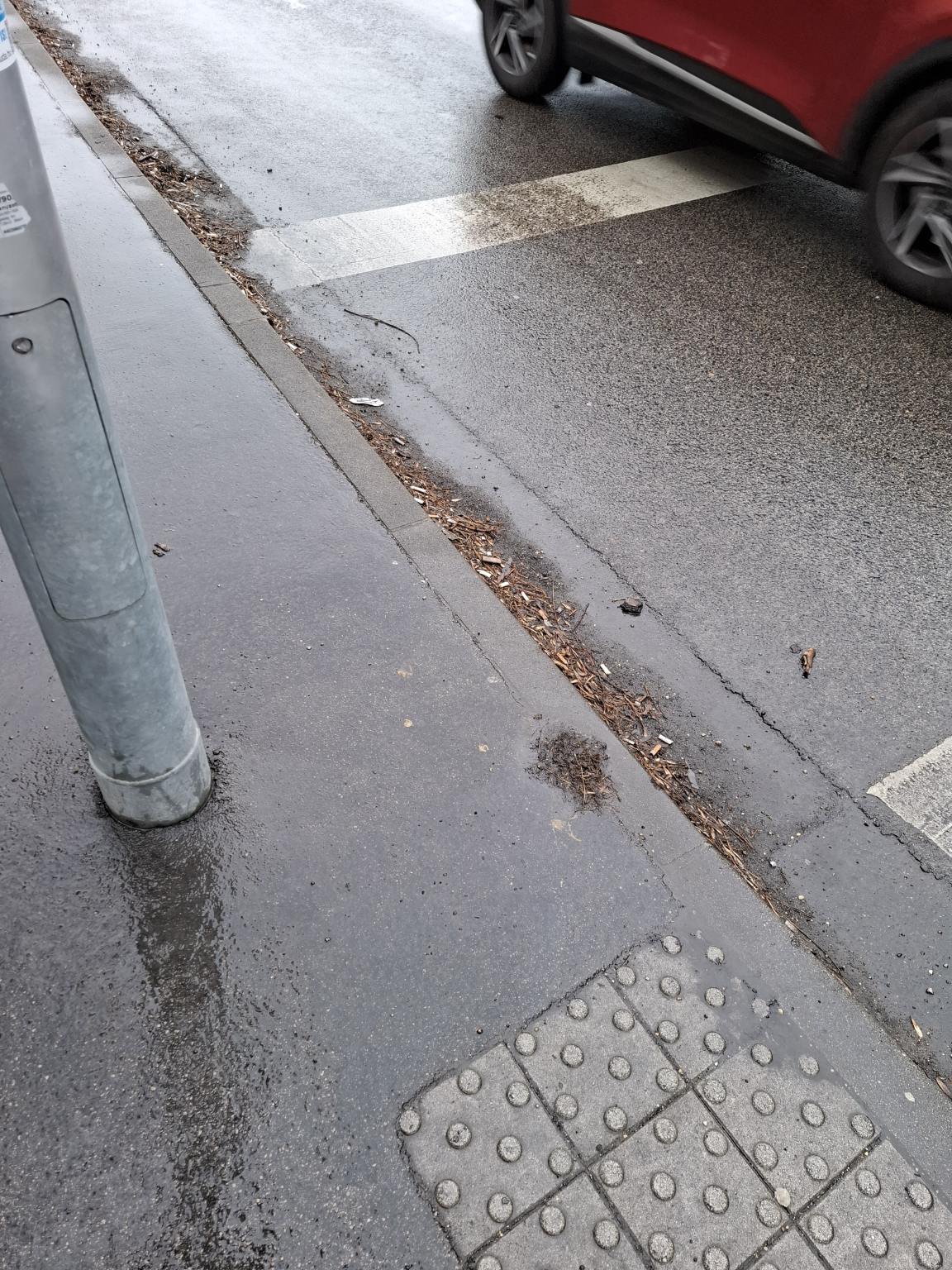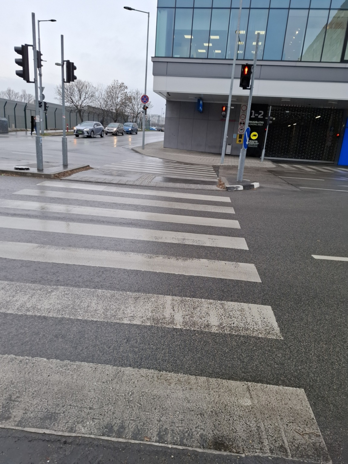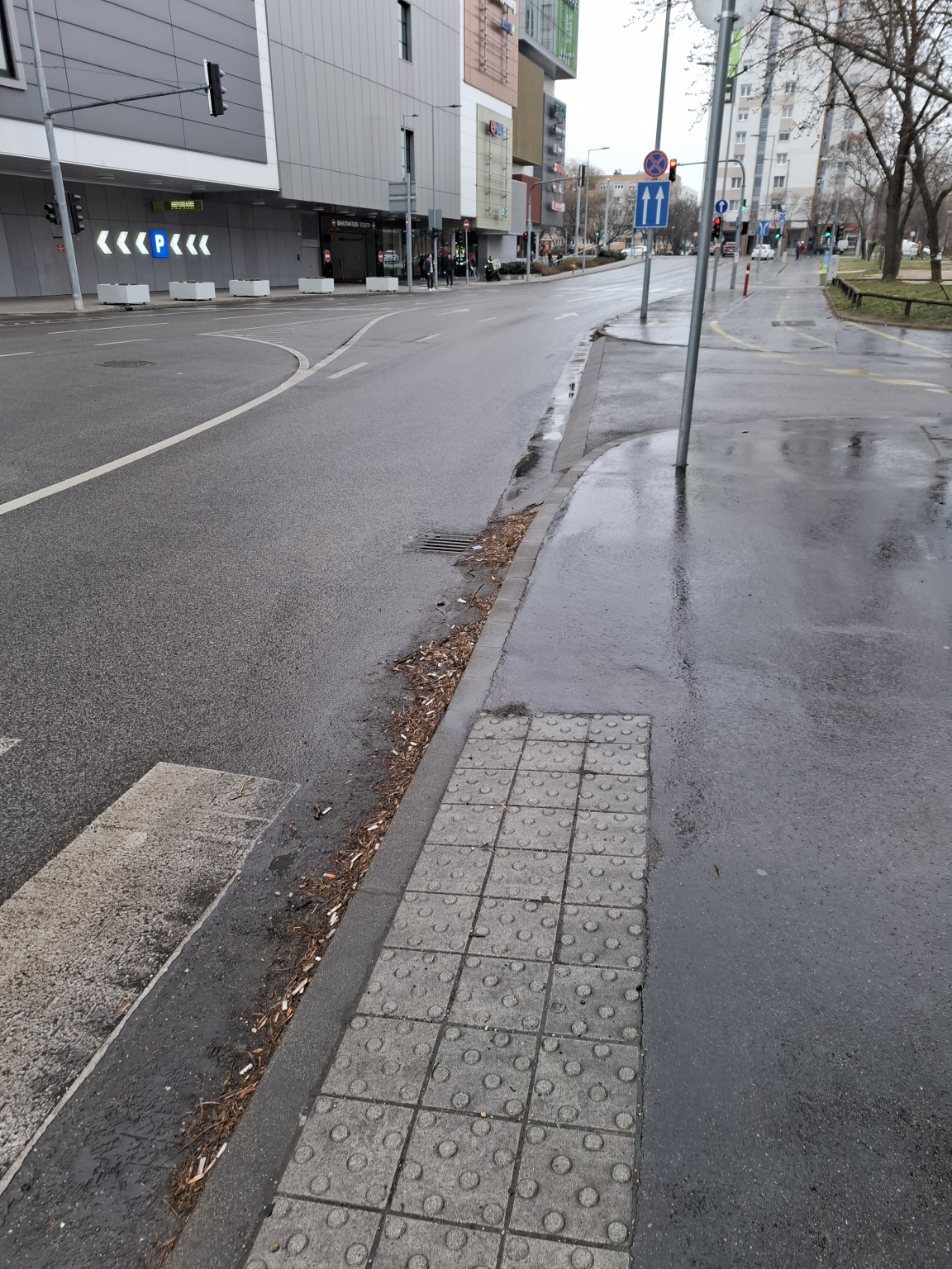 Az Etele pláza szélén a gyalogátkelőhely körül sok a szemét, homok, eldobált cigicsikk.