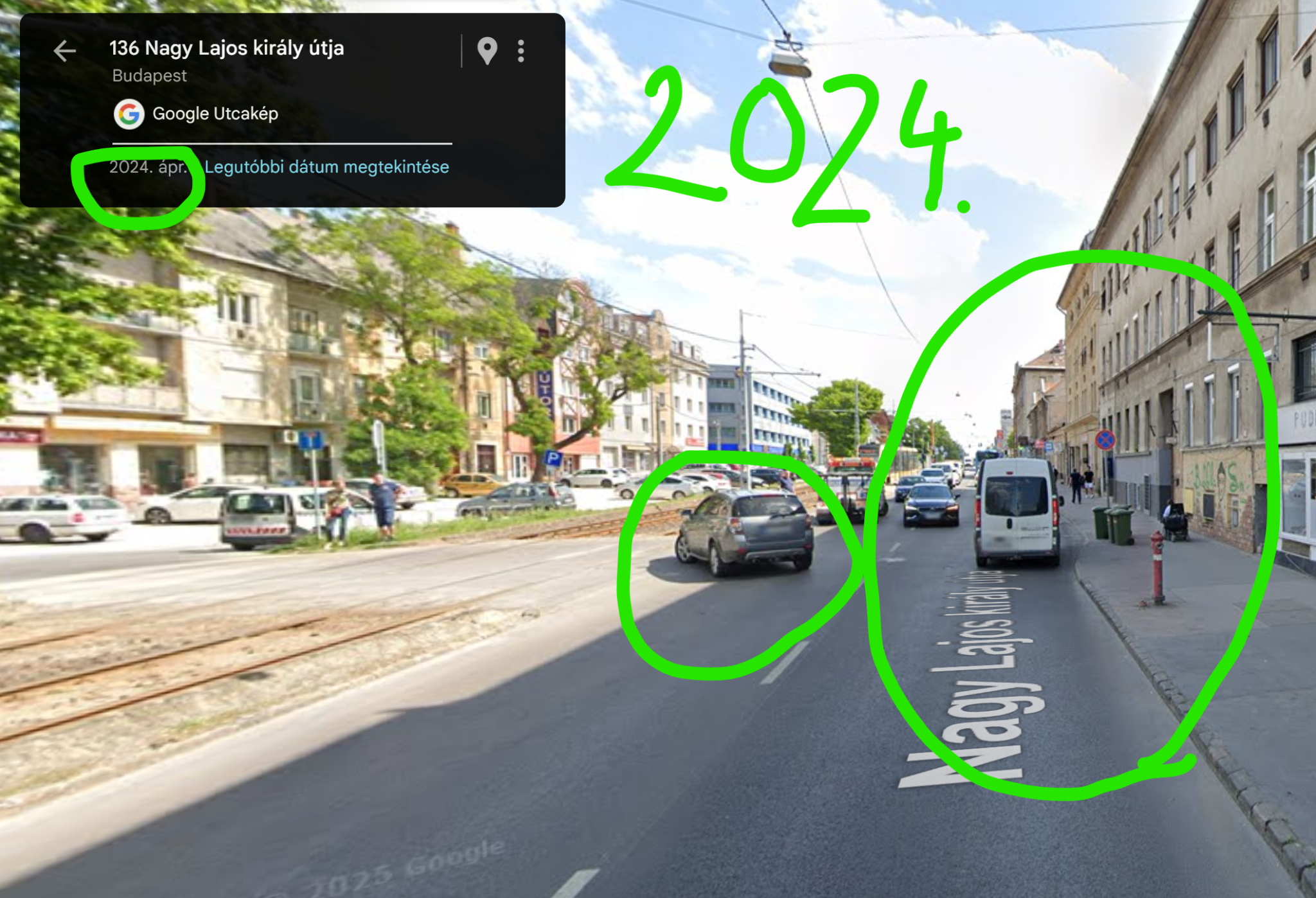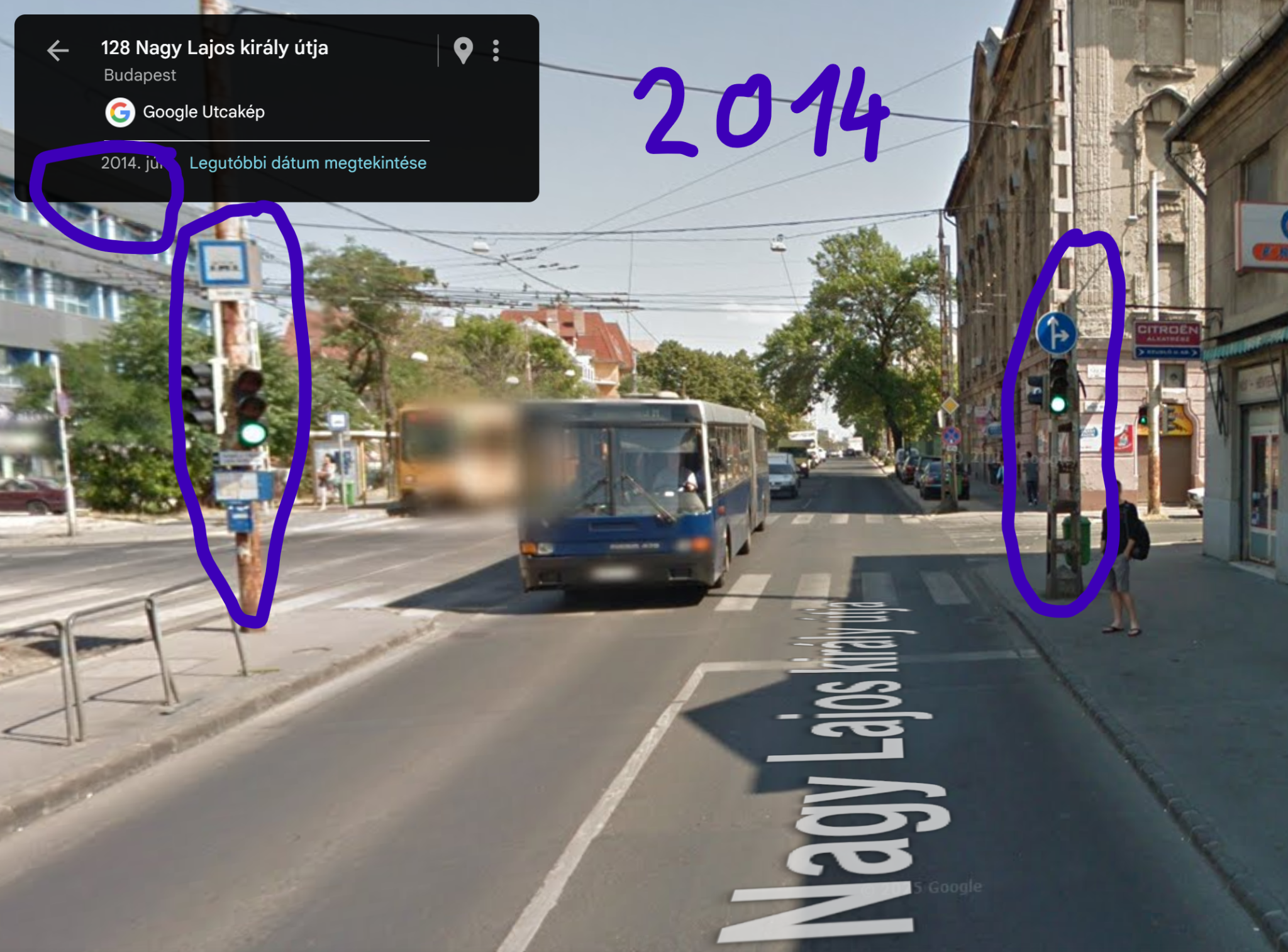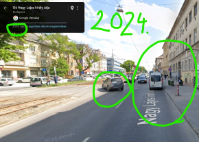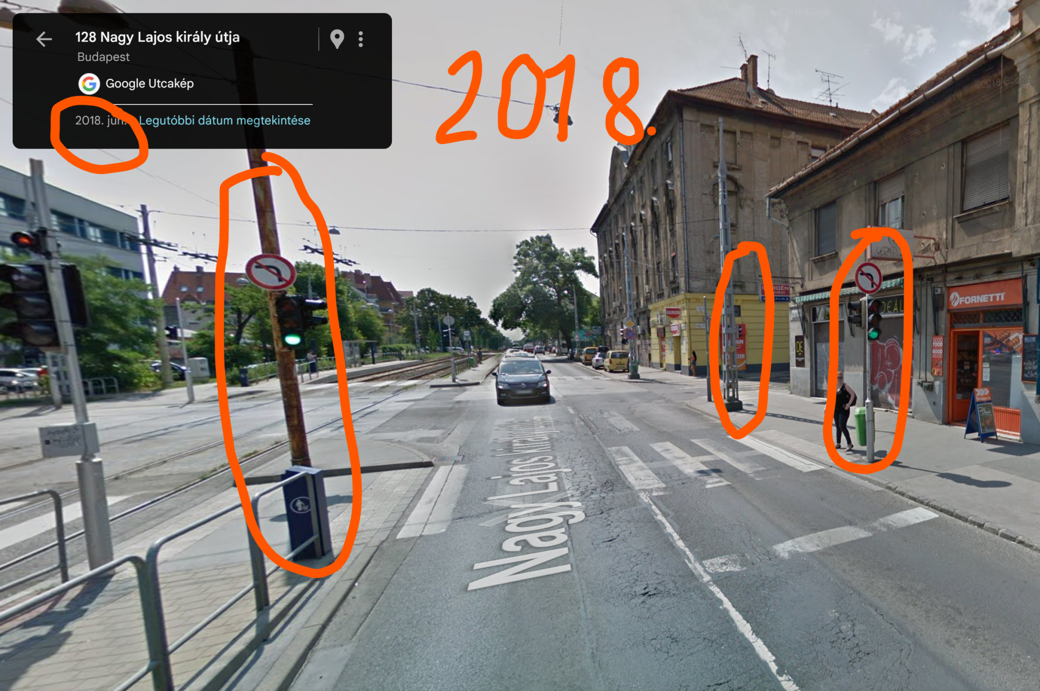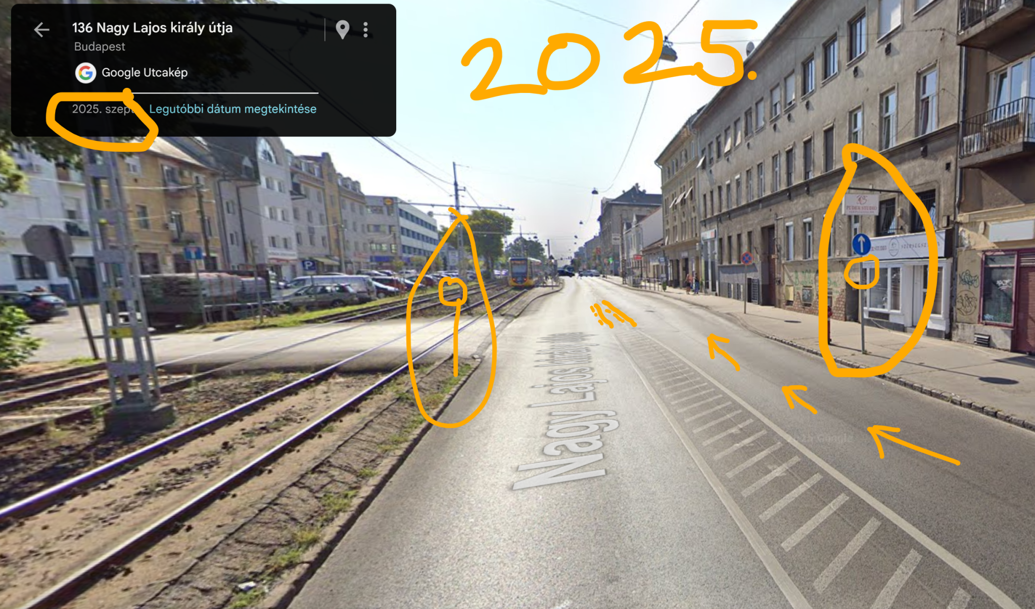 A Szugló utca - Nagy Lajos király útja kereszteződés átépítésekor is egy darab kék tábla helyett két darab piros tiltó tábla került ki 2014 és 2018 nyara között, talán nem véletlenül. Legalább annyira indokolható a tárgyi kereszteződésben a javasolt módosítás, különös tekintettel arra, hogy ott korábban (nem is olyan régen) lehetőség volt a szabályos balra kanyarodásra, lásd a 2024. évi és 2025. évi utcaképeket is. Tábla csere nélkül a figyelmetlen autósból esélyesebben lesz villamossal ütköző, balesetet szenvedő autós, vagy éppen a közterület-felügyelők örök vadászmezejének a fenntartása lehet még cél, akik akár tizen is, több autóval érkezve a helyszínre, kamerával felszerelkezve lesik az áldozataikat (ahelyett, hogy pl. a balra kanyarodást megakadályozandó a kék tábla mellett figyelmeztetnék az esetleg balra kanyarodni készülő autósokat a helyes haladási irányra!).”