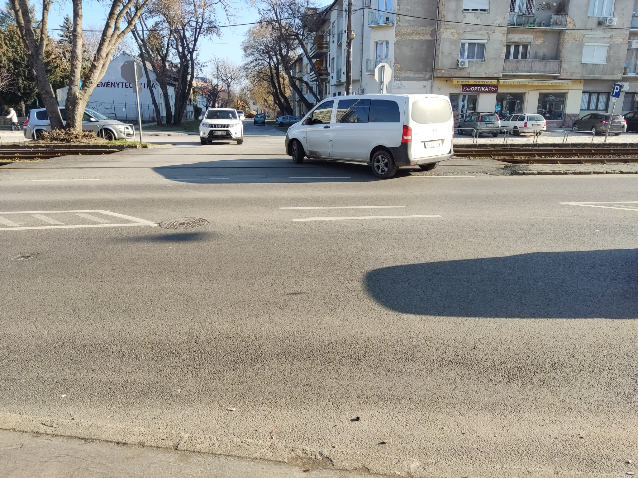 A kereszteződésben a forgalmi rend megváltozott, a korábbi balra kanyarodási lehetőség a kihelyezett kötelező haladási irány előre tábla miatt megszűnt. Azonban különösen a reggeli órákban szemből laposan érkező, vakító napfényben ez nem látható jól. (Tovább növeli a balra kanyarodás megtörténtét, hogy a szemből érkező járművek - nem látva a kötelező haladási irány táblát - lassítanak és elengedik a balra kanyarodni szándékozókat, miközben a Nagy Lajos király útján érkeznek a Bosnyák tér előtti villamosos-lámpás kereszteződéshez.) Elképzelt megoldási javaslatok. 1. Kötelező haladási irány egyenesen felfestése az útburkolatra. 2. Balra kanyarodni tilos felfestése az útburkolatra. 3. (Szimpla/Dupla) Záróvonal felfestése a kereszteződésben az útburkolatra (de a villamos sín felől érkezőknek szaggatott). 4. Balra kanyarodni tilos tábla kihelyezése az út bal és/vagy jobb oldalára (is). 5. Kötelező haladási irány (egyenesen) tábla kihelyezése az út bal oldalán is. (Akár a fenti javaslatok kombinálásával.) Köszönjük szépen!