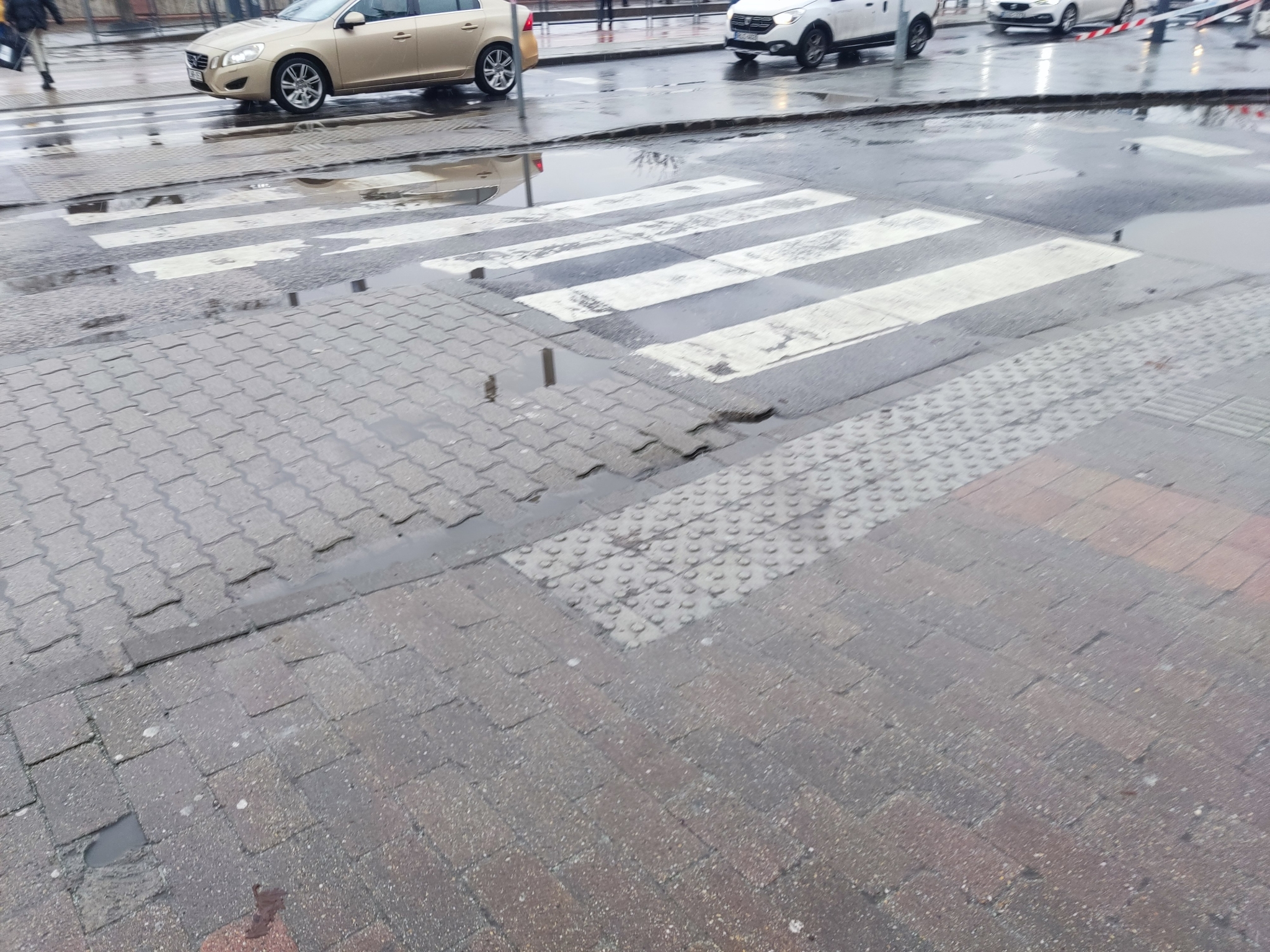 Botlásveszélyes zebra. Sérült, hiányos burkolat.