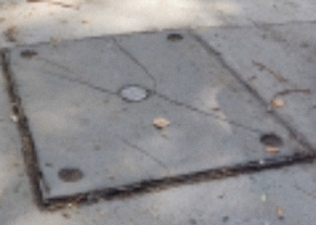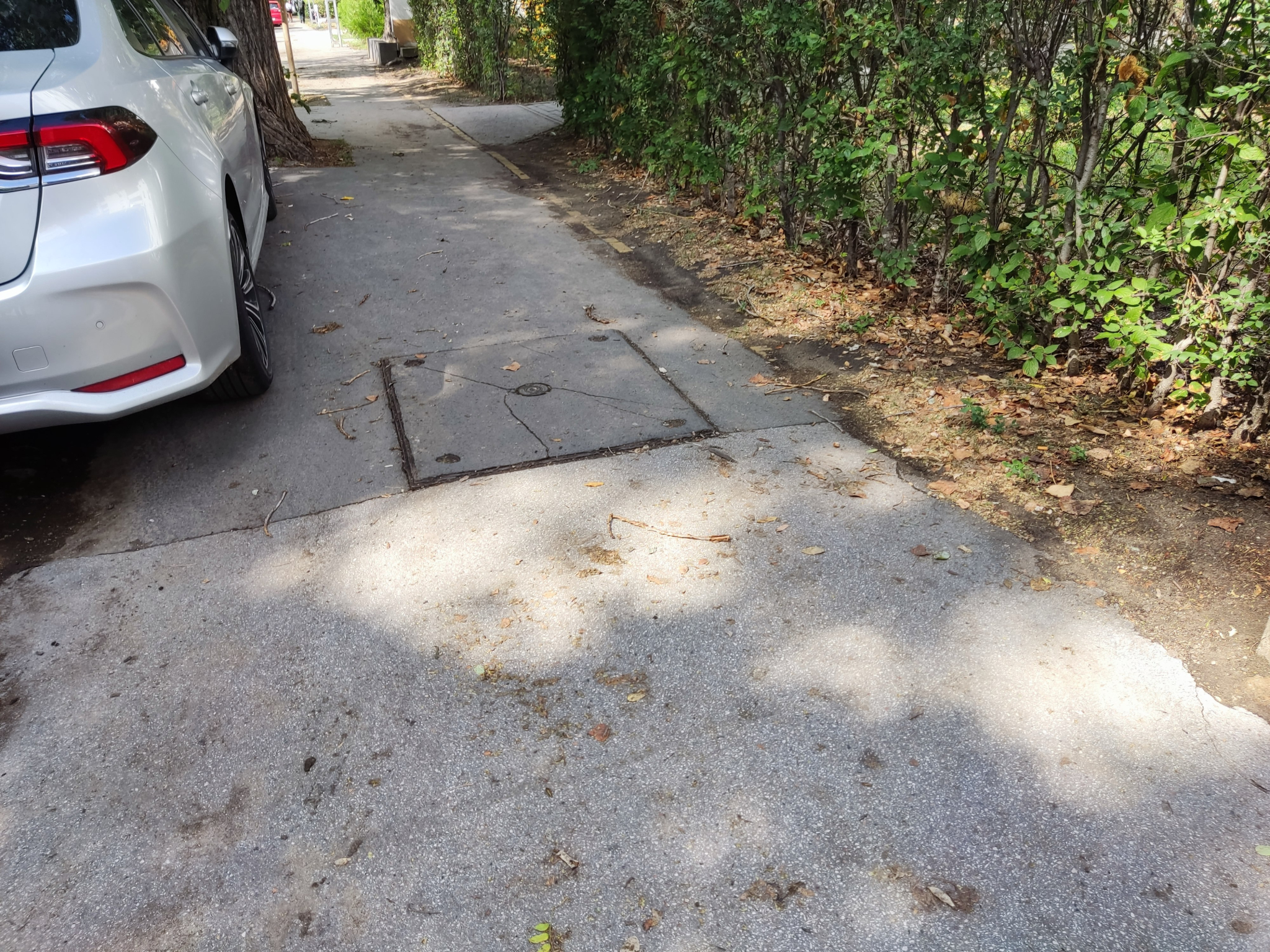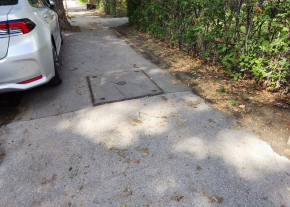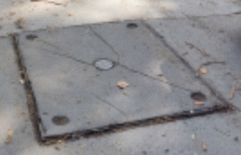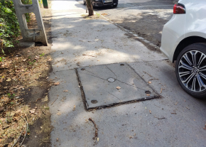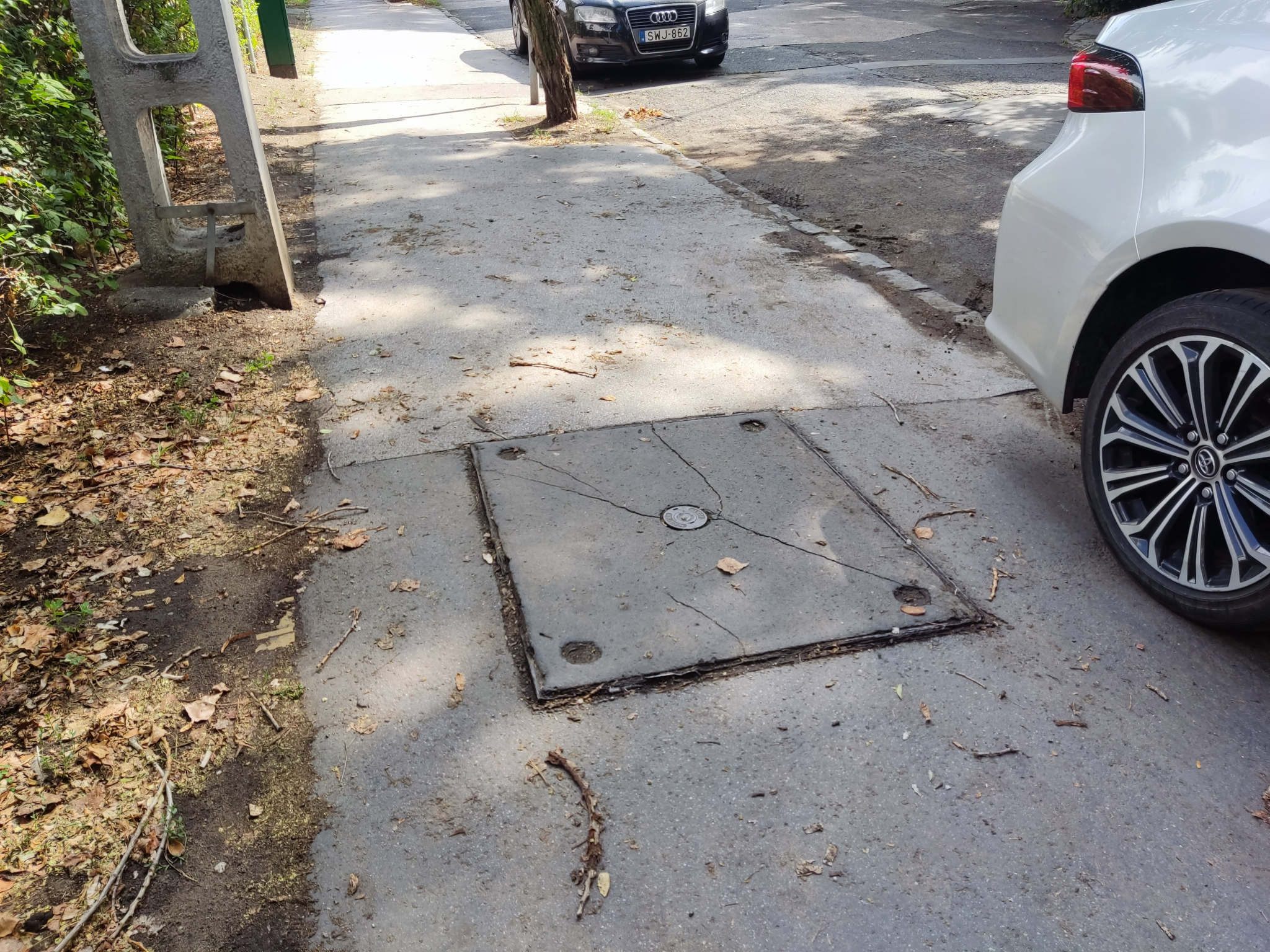 Kiálló, botlásveszélyes aknafedél - Magyar Posta felirat