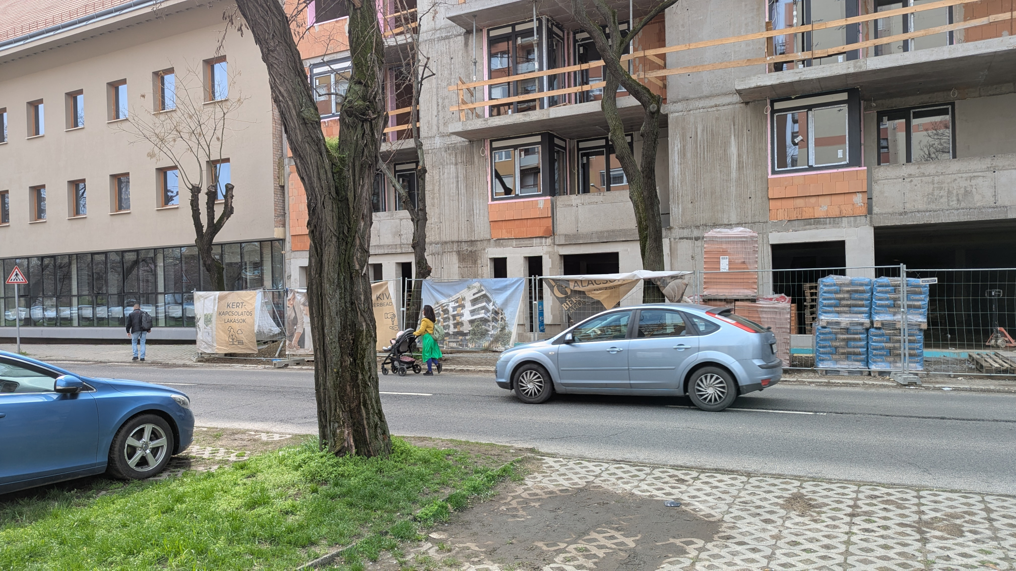 A mellékelt fotókon látható, hogy az úttest túloldalán kerékpárút fut, amelyre nem tanácsos ráterelni a gyalogosokat, a következő párhuzamos járda pedig csak jelentős kitérőkkel és áldozatokkal érhető el.