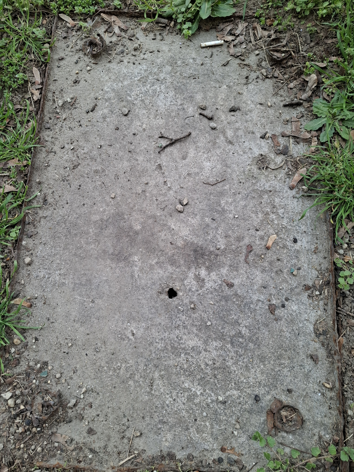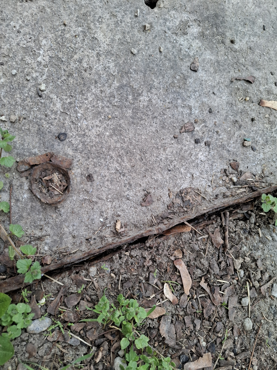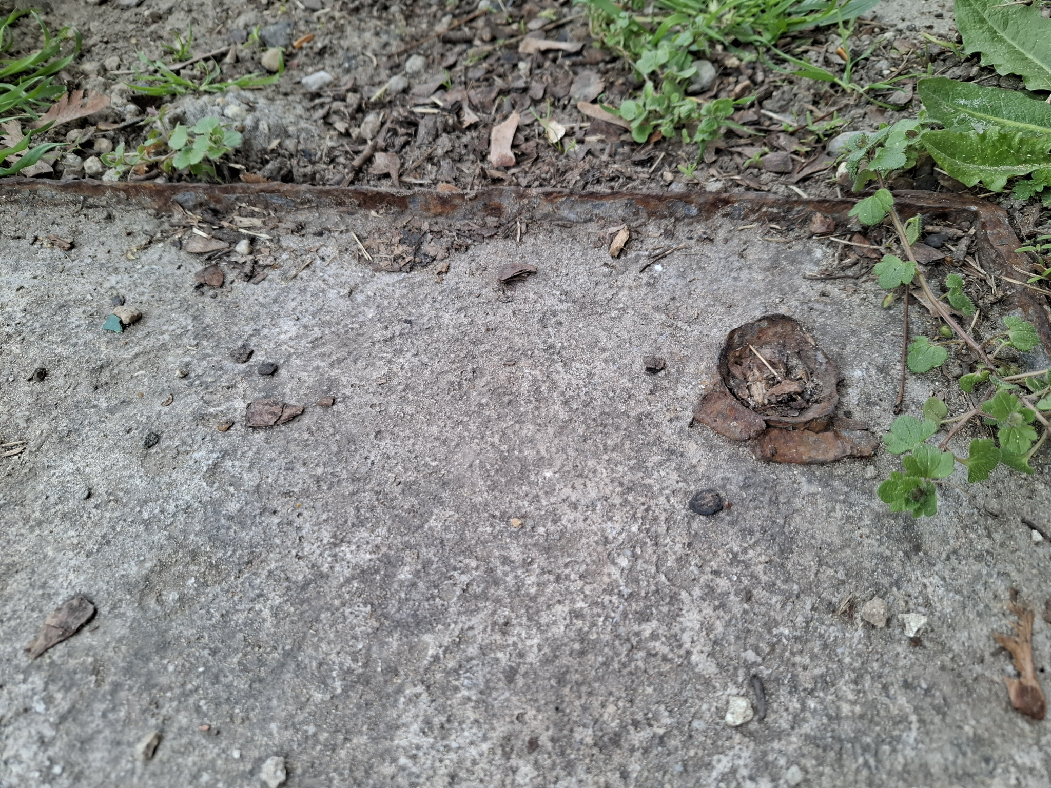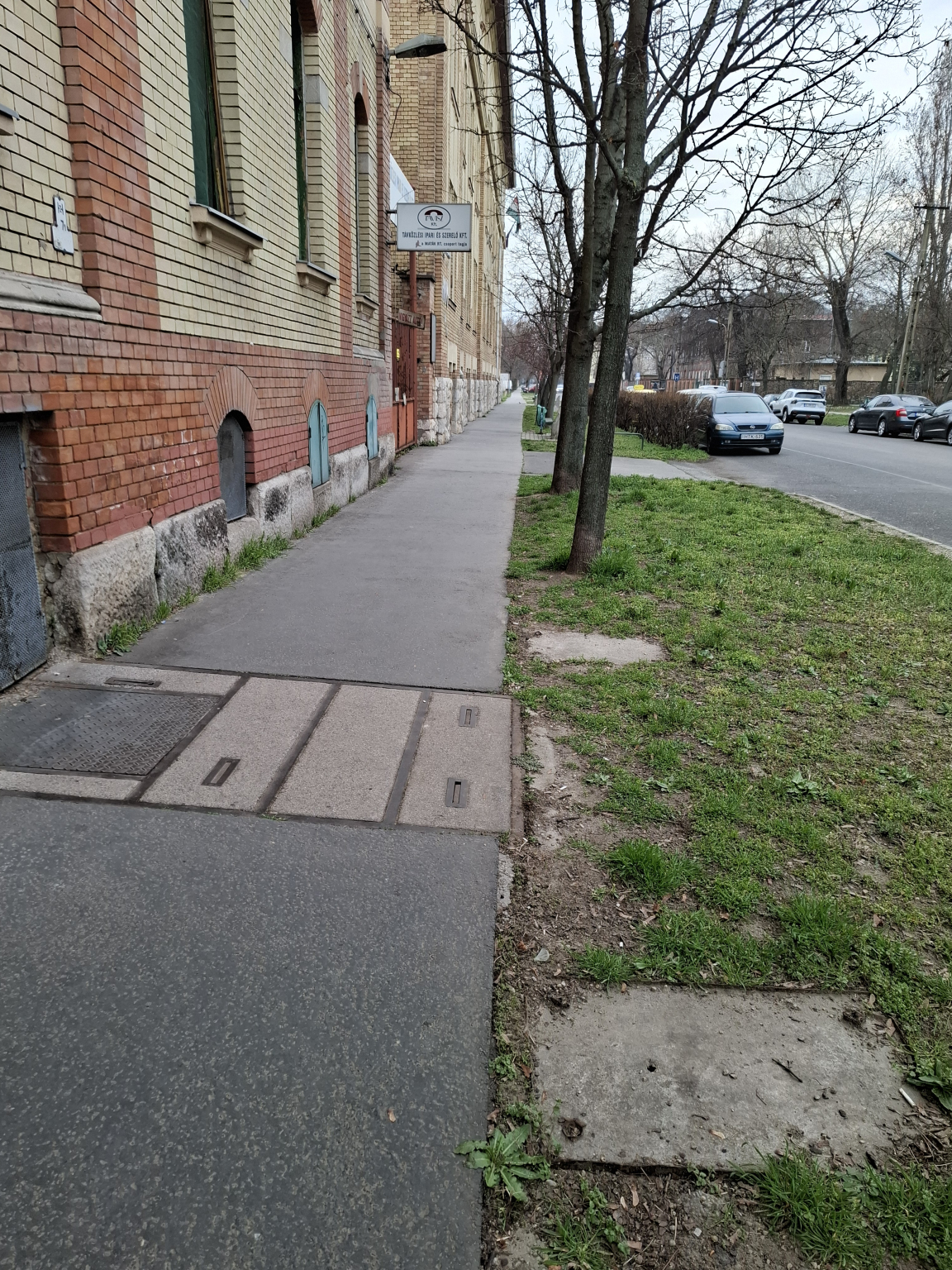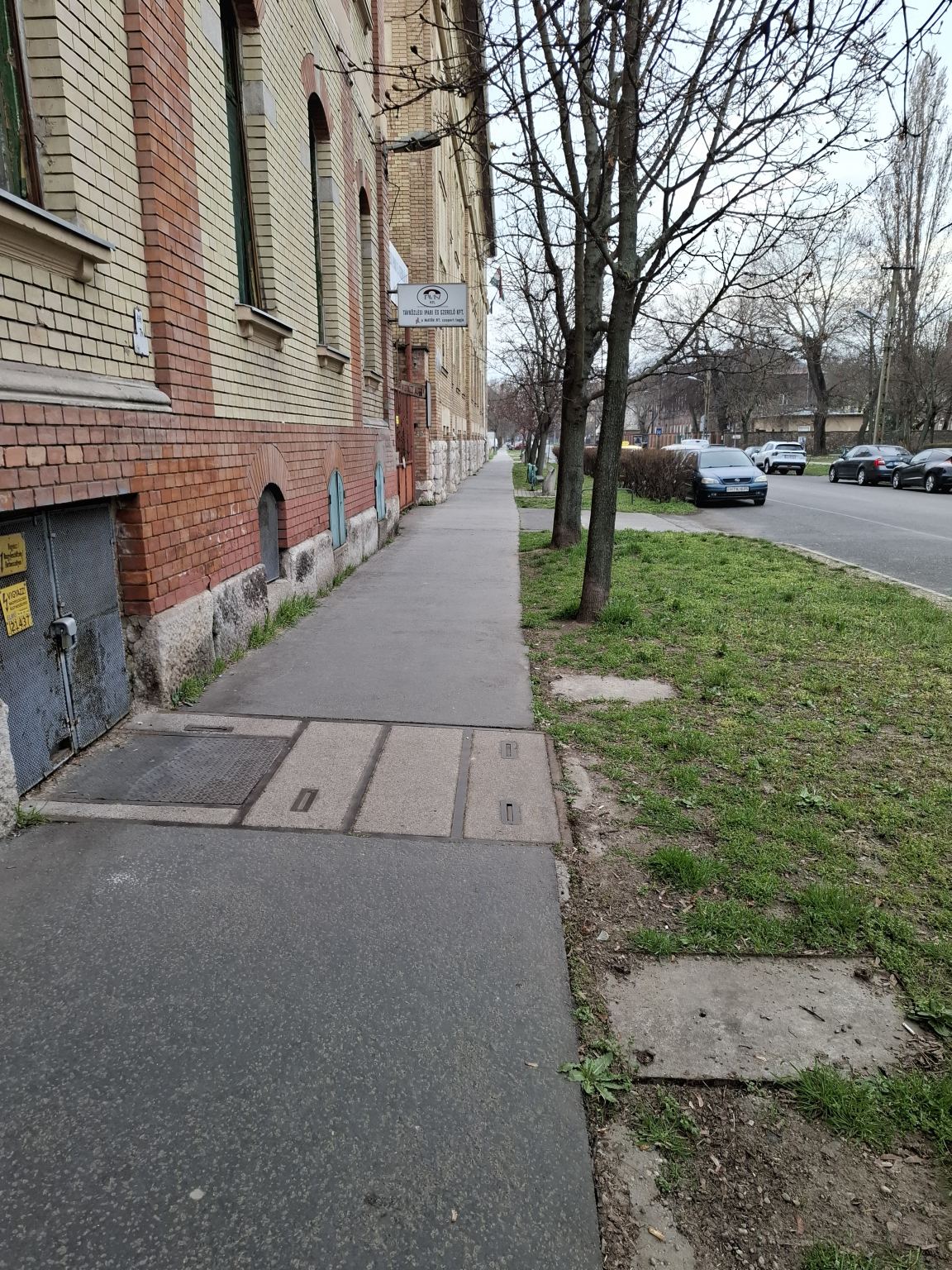 Az iskola előtt a kisméretű fedlap lyukas, széle rozsdás.