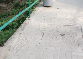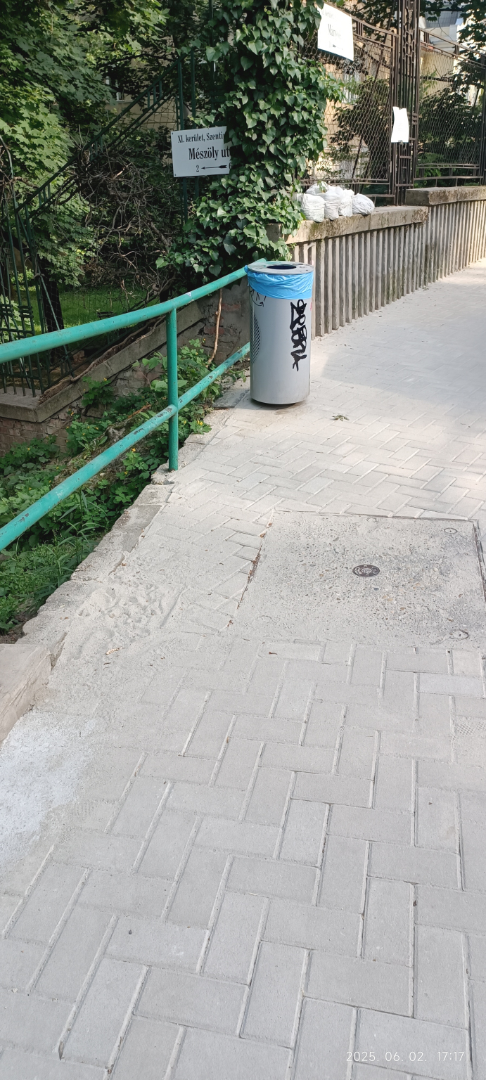 A Mányoki út - Mészöly u. sarkánál található lépcsősor tetején megsüllyedt a járda, nagy lyukat képezve amely megtelt szeméttel, az esővizet elnyeli és alámossa a járda többirészét illetve a a lépcsősor korlátját tartó betonszerkezetet.