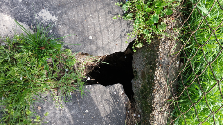 Budapest, XXII ker. GÖRGEY utca 22. sz. előtti járdán,a kerítés mellett mély lyuk tátong.