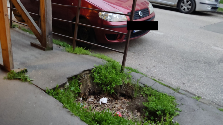 Hatalmas gödör a zöldsávban az iskola előtt.