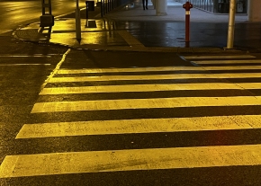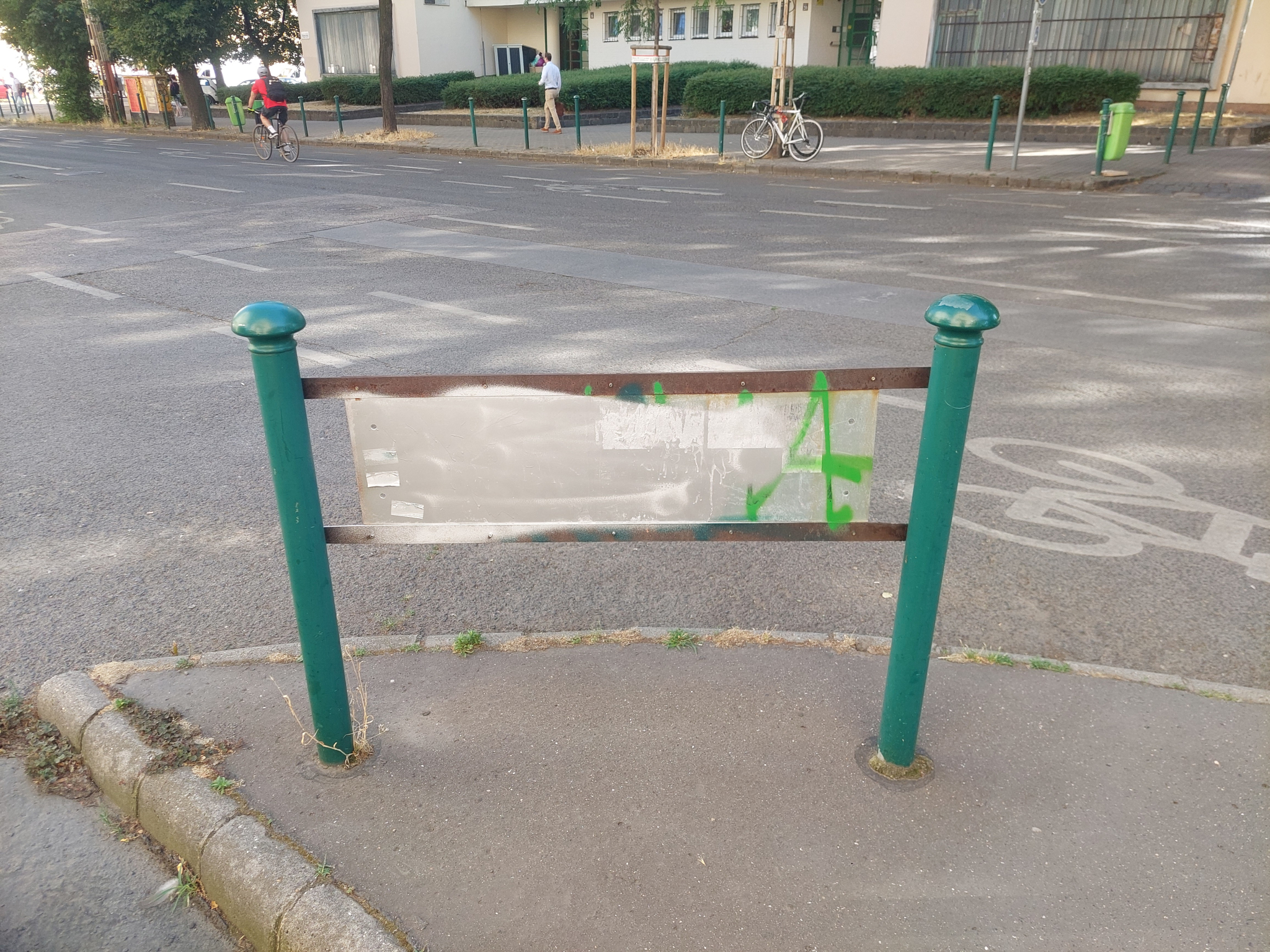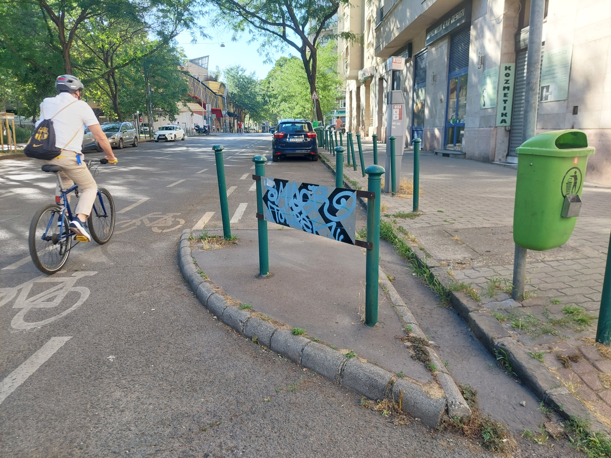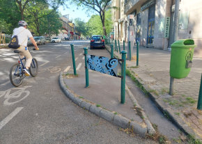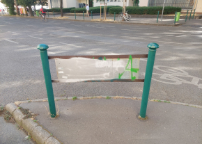 A Bulcsú utca 21 előtt a Tüzér utca torkolatánál a járdaszigetet jelző tábla mindkét oldalának jelentős része össze van fújva festékszóróval.