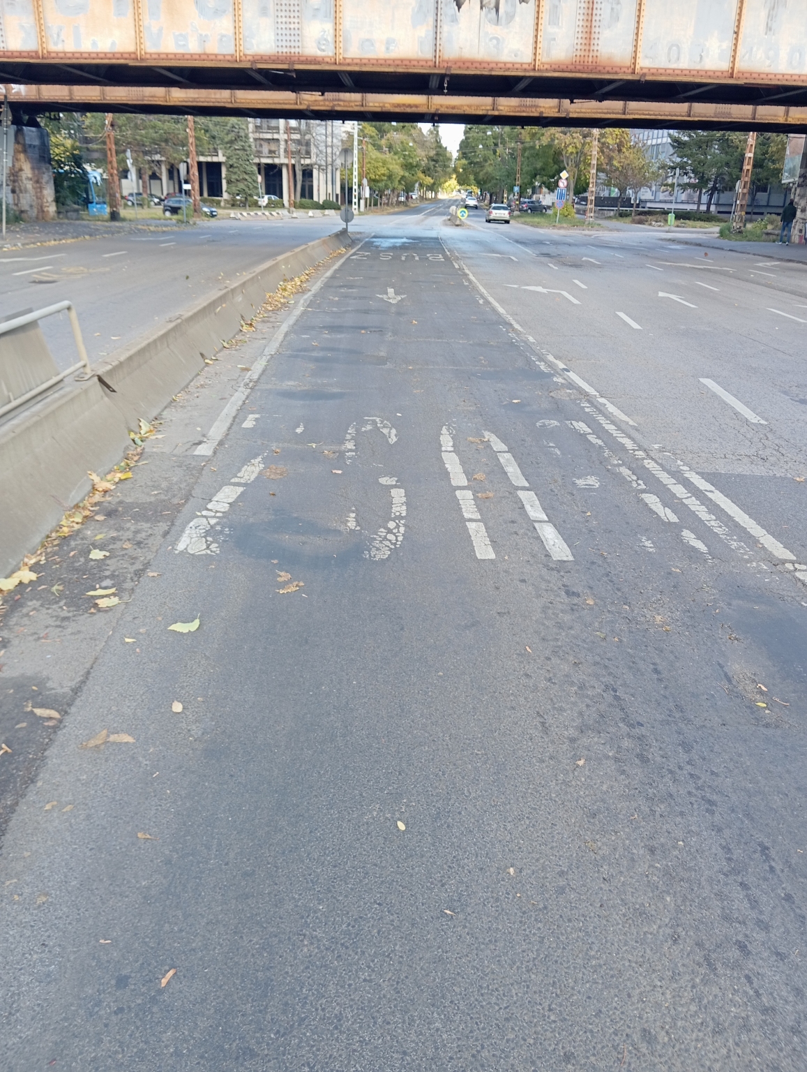 Kátyúkkal sűrűn teleszórt útszakasz a buszsávban