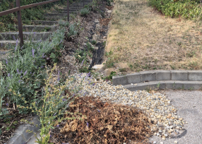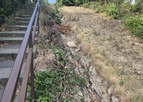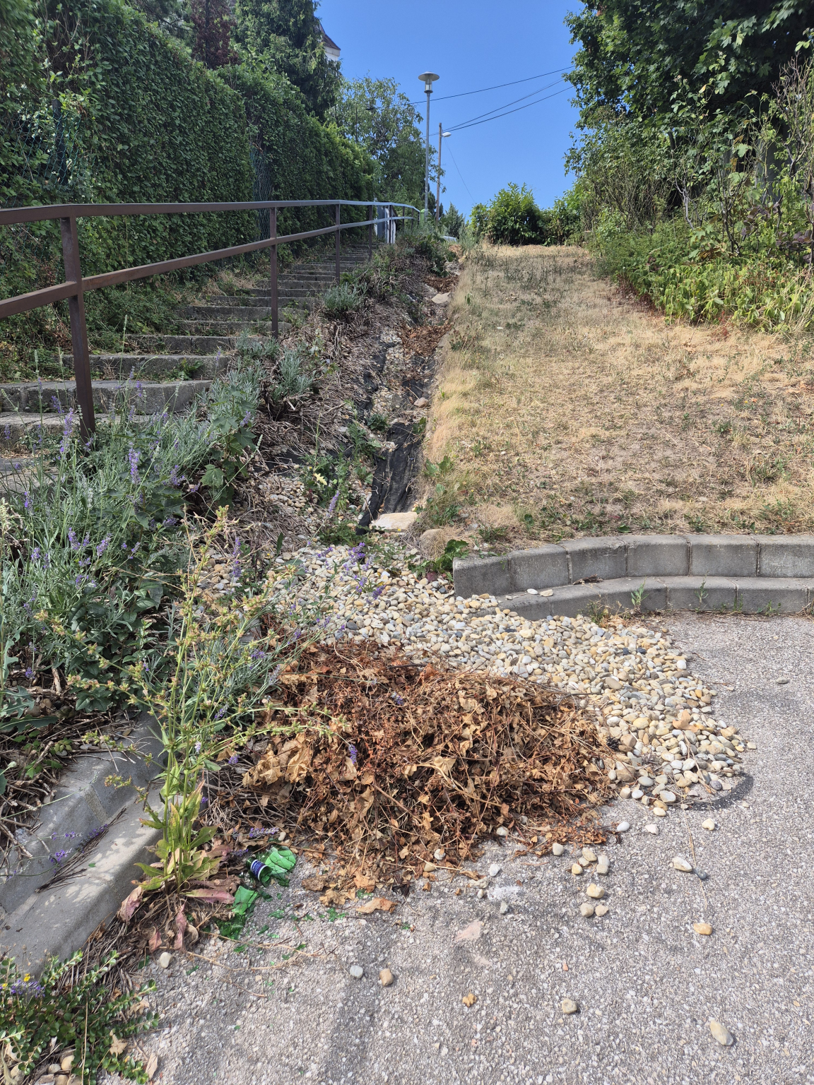 Eddig a ronda kimosott árkot a megnőtt levendulák eltakarták, azonban pénteken a szomszédunk egyeztetés és kérdezés nélkül elrendelte a levendulasor tövig nyírását, amitöl újra látványos lett a probléma.