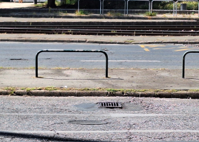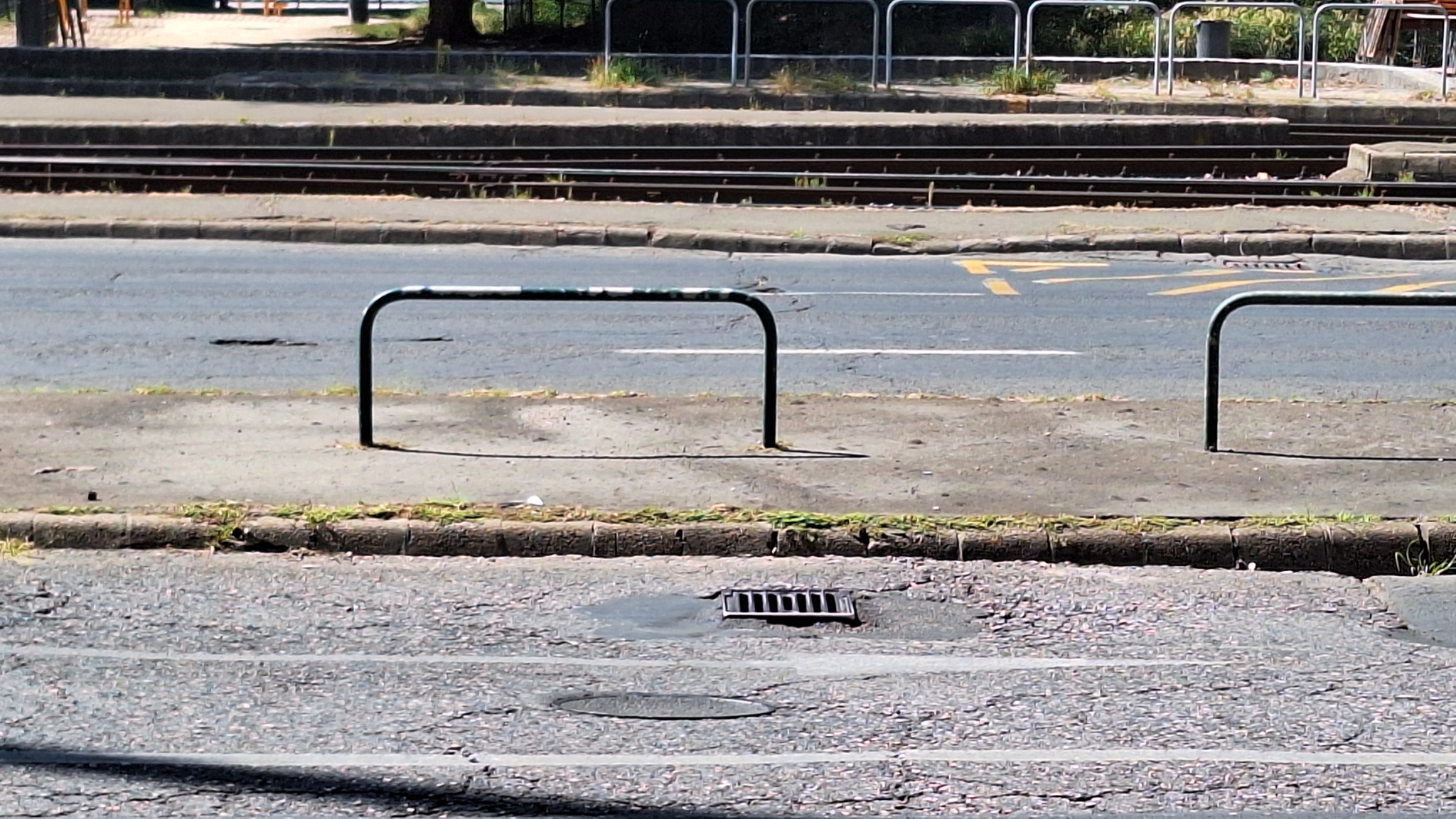 A Közraktár utca 30. előtt erősen kiáll az útpályából egy csatornanyílás.