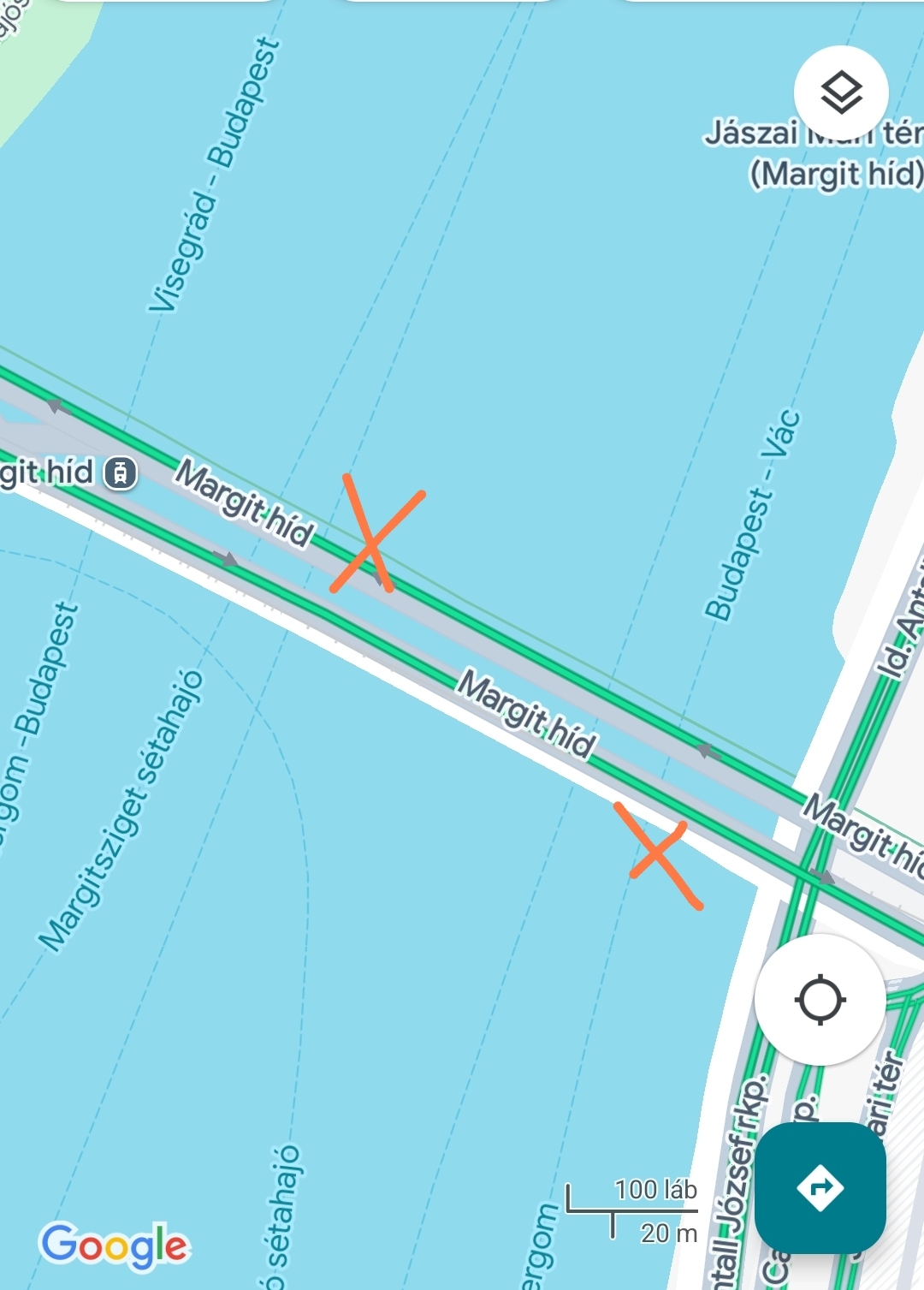 A Margit híd Pest-Sziget szakaszán, a térképen jelölt helyeken kiégtek a lámpák: