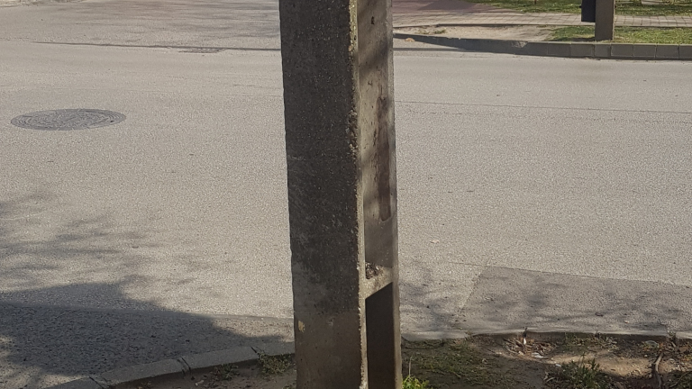 A villanyoszlopnak csak a csonkja maradt a járda mellett.