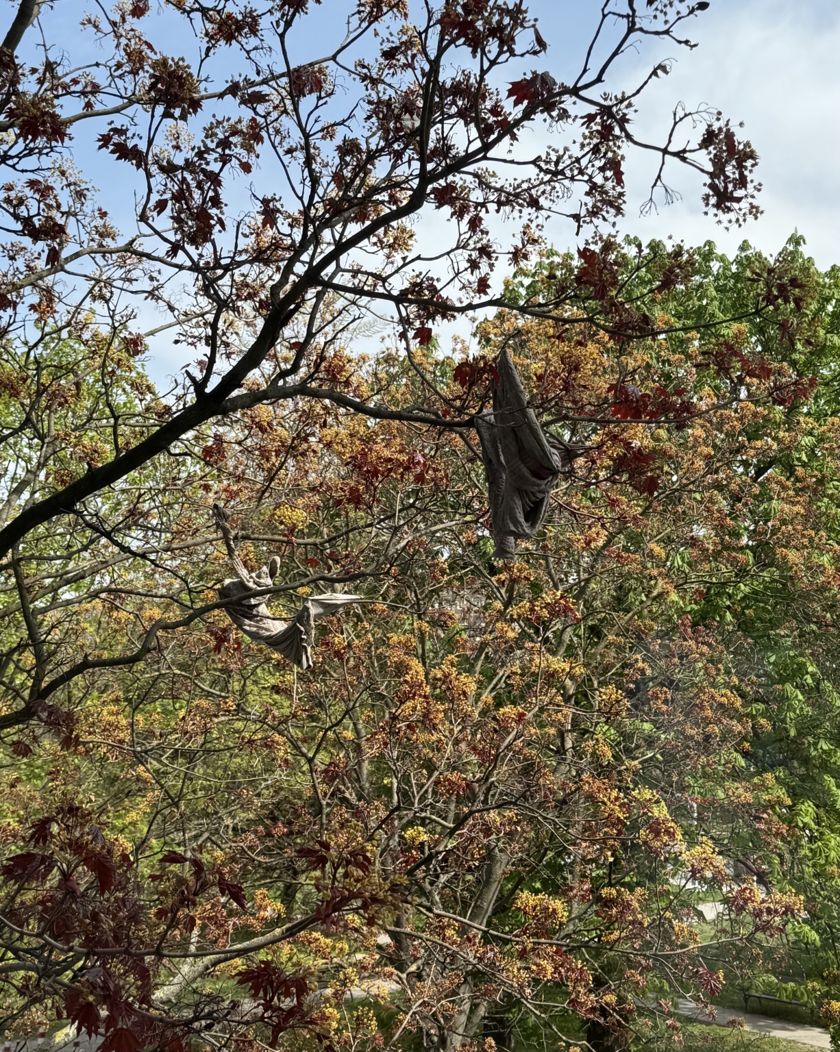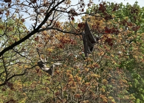 1039 Budapest Szindbád utca 1. előtti fàn 2 ruhadarab lóg közel 5 éve. A magasság miatt egyénileg levenni őket nem lehetséges. A ruhák zavaróak a látvány szempontjából, és idővel szennyezhetik a környezetet is.