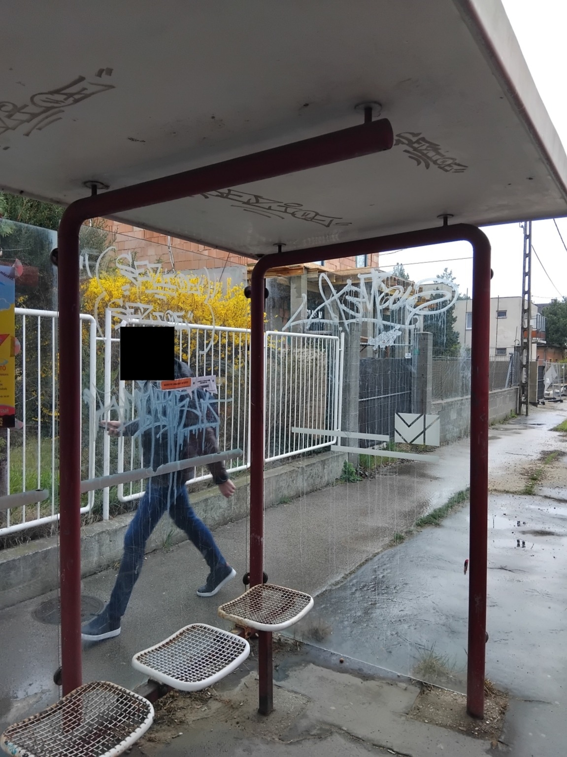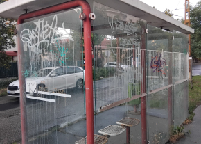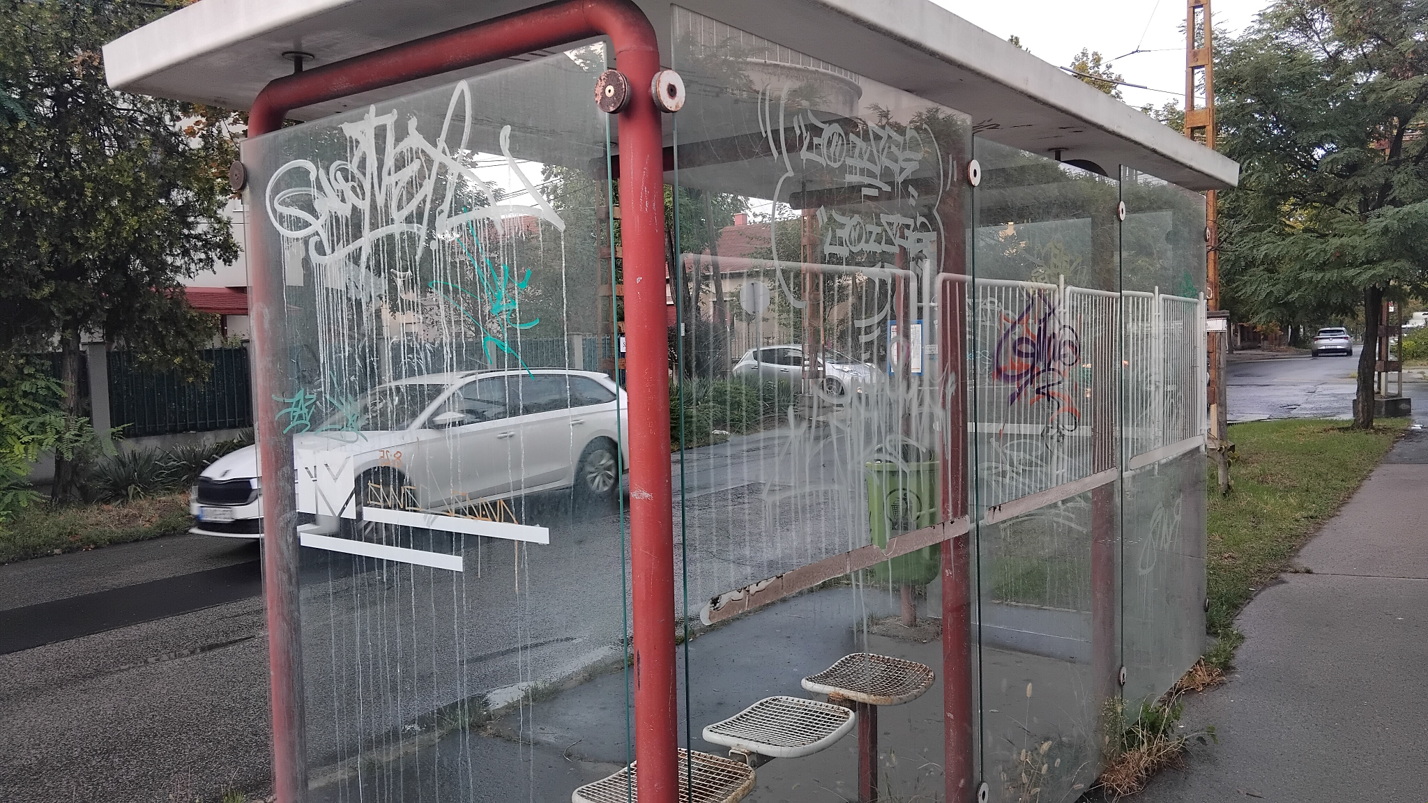 Egy kis karbantartást hadd kérjünk erre a váróra - graffiti, rozsdás székek, kopott tartószerkezet.