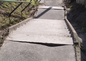 Kérem mérjék fel a lépcső állapotát és javítsák! Megsüllyedt burkolat, letöredezett darabok.