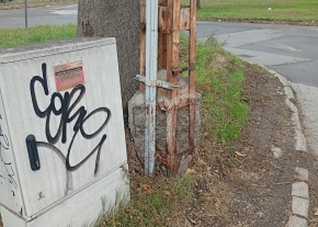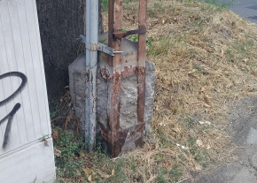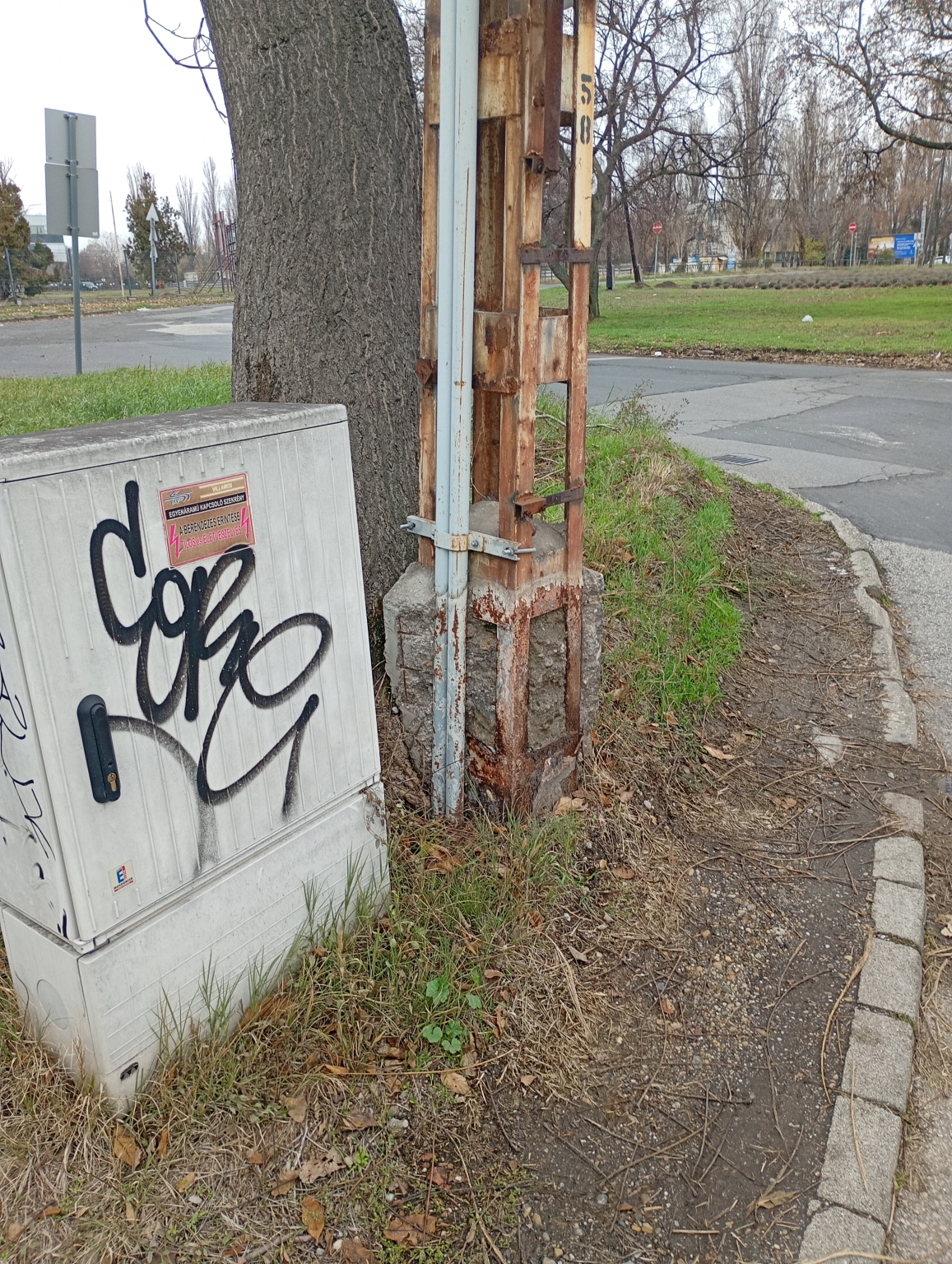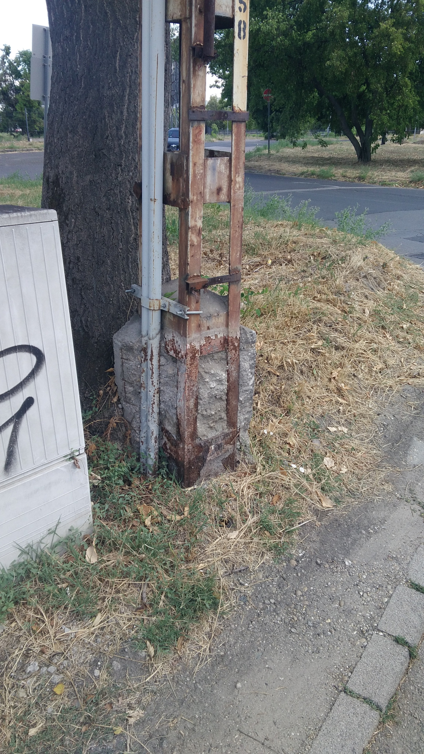 Kérem az illetékest, hogy a képen látható villanyoszlop alját betonozzák újra, és szállítsák is el a leszakadt darabot!