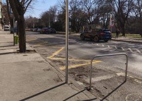 „Közvetlenül a zebra előtt leraktak kerékpártámaszokat, ez elvileg egy Mobi-pont, de a táblázás még nem került ki. A buszmegálló után közvetlenül még mindig parkolnak, felfestés nem készült.