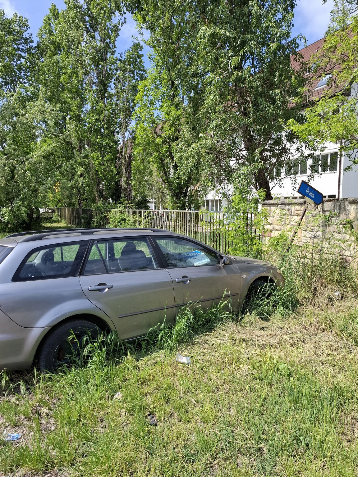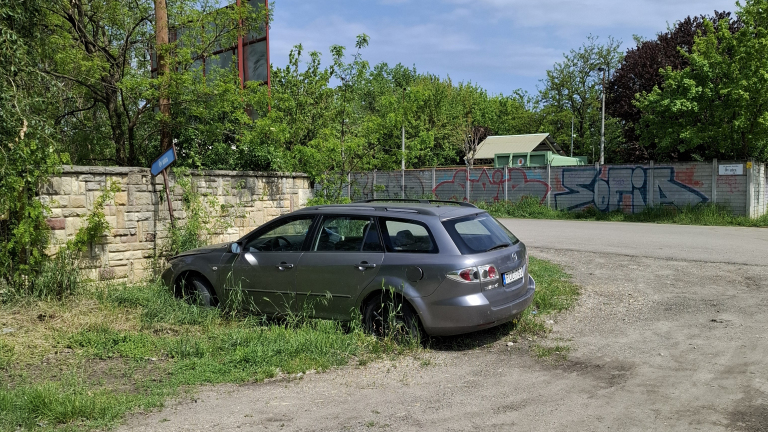 Az Öv utca és a Füredi út kereszteződésében zöldterületen parkol már régóta egy elhagyott gépjármű.