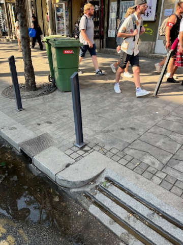 Múzeum körút 5 előtt van egy kapubeálló. A beálló mellett hiányoznak (soha nem is voltak?) a parkolásgátló oszlopok, így rendszeresen parkolnak az amúgy is keskeny járdára (ingyen) , nehezítve a gyalogosforgalmat.