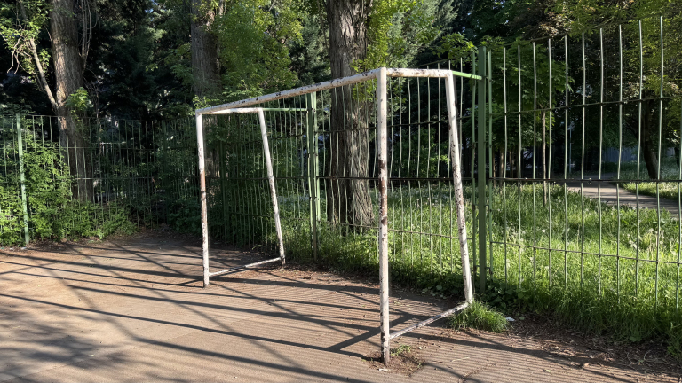Rossz állapotú focipálya és pad