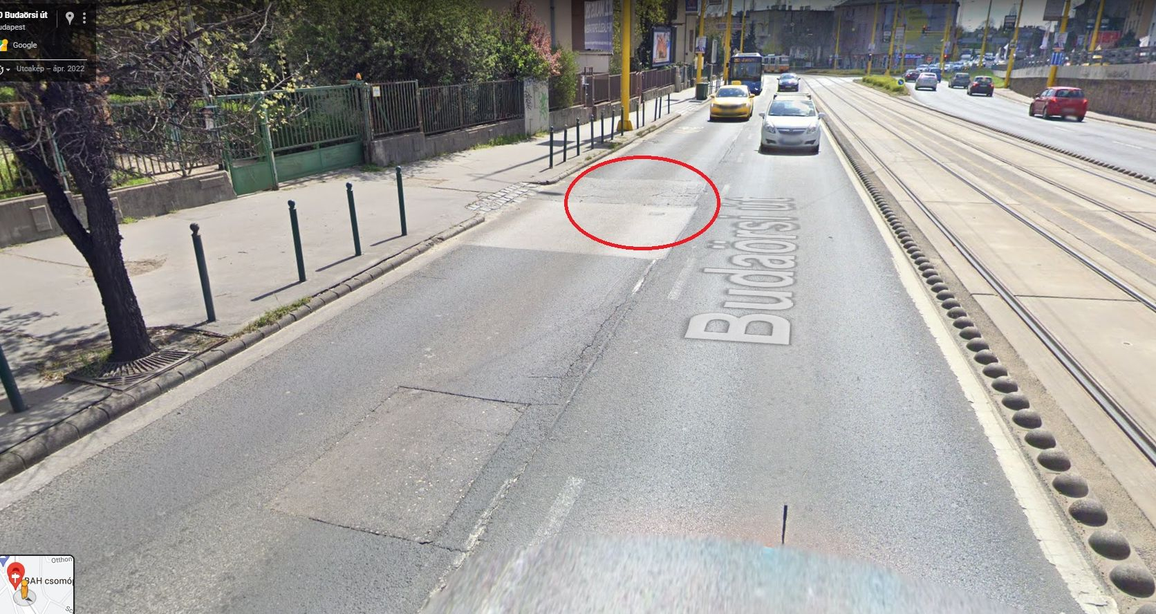 A Budaörsi út 20-nál, a Hotel Mediterran előtt is található egy nagy kátyú az útban, pont a jobb kerekek nyomvonalában.