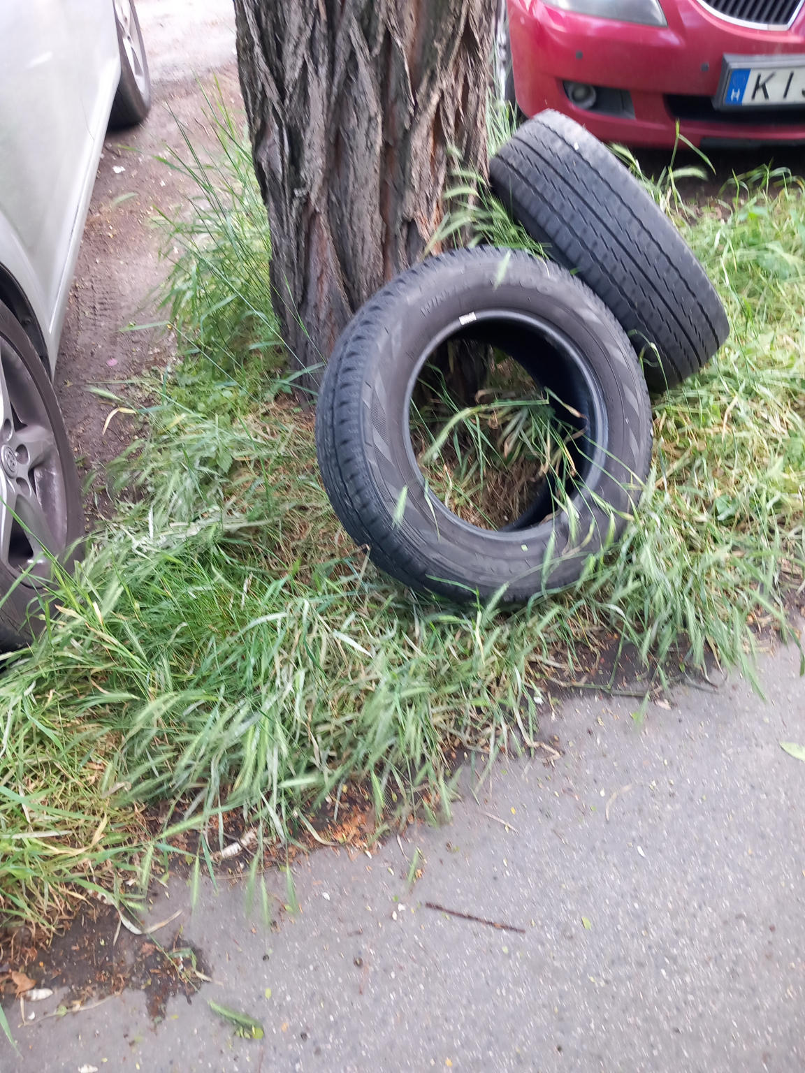 2 darab elhagyott autógumi található a Lipótvâr utca 4. előtt a fának támasztva.