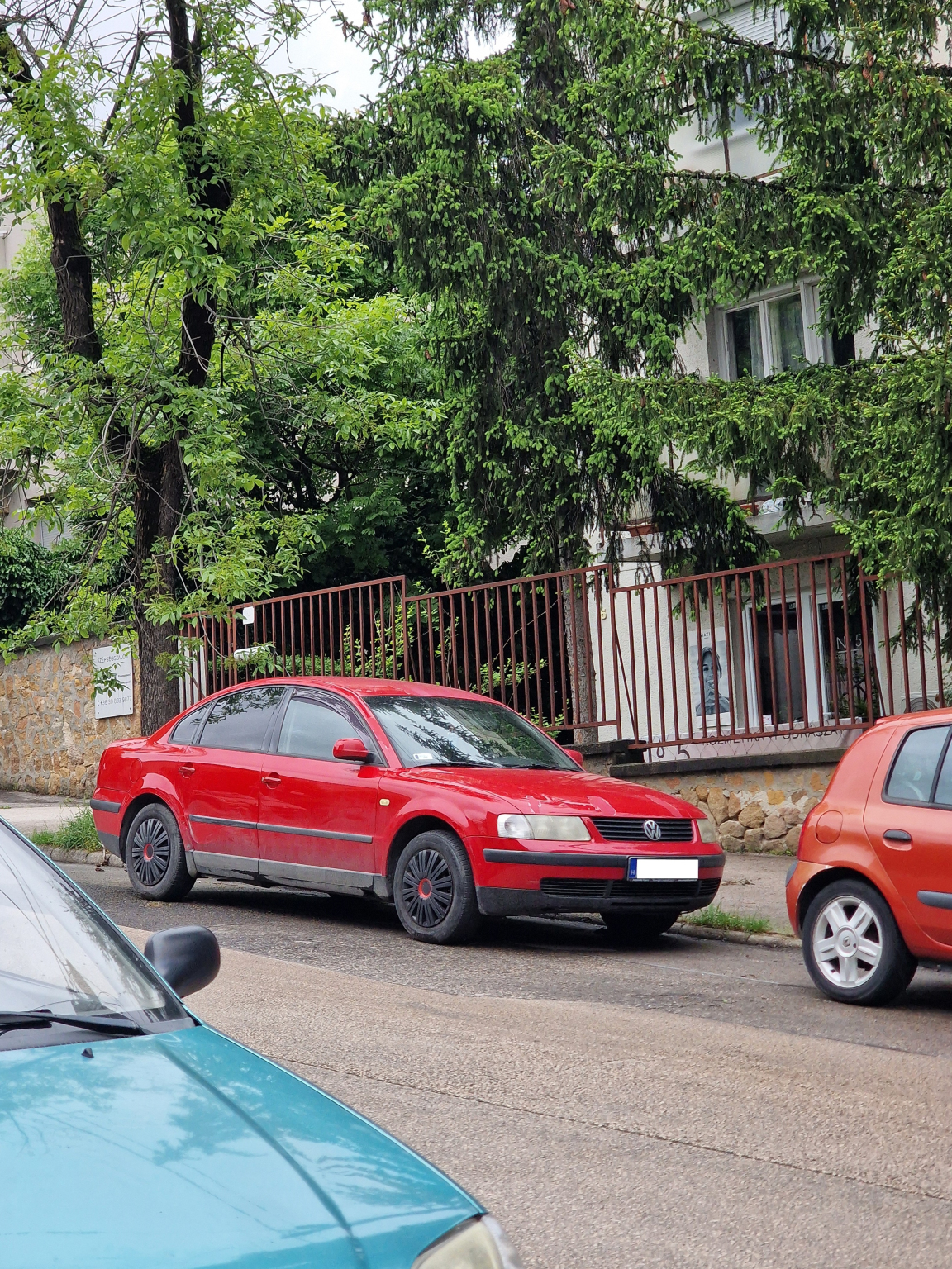 1999-es piros VOLKSWAGEN Passat várakozik a Pannonhalmi út 5. előtt, műszakija 2025.02.04-ig volt érvényes.