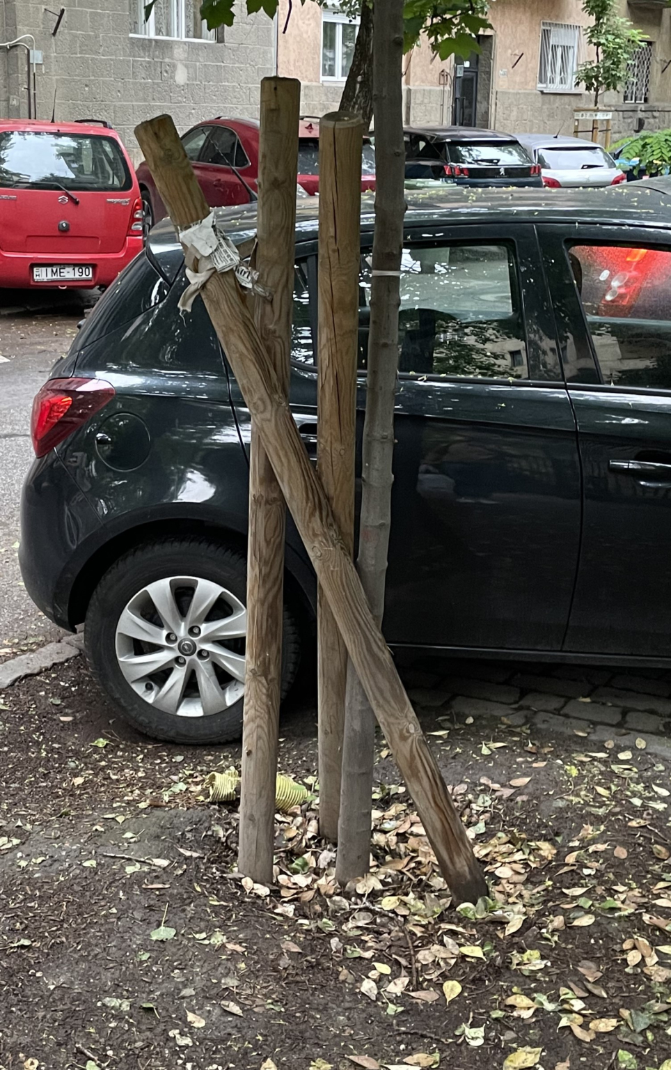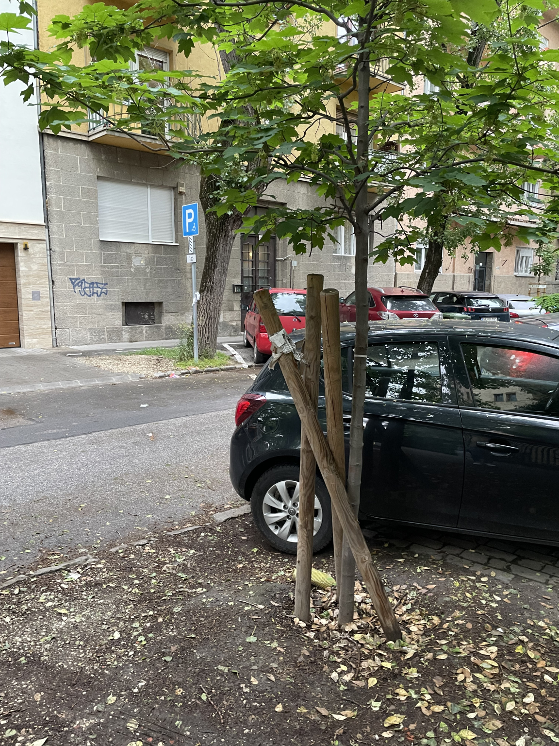 A Kanizsai utca 49. számmal szemben a parkolóben fapótlásként elültetett fiatal fának a karózása összedőlt. Jelenleg inkább a fa tartja a karókat, mint a karók a fát. Javaslom a kórózás kijavítását, amíg kellően megerősödik a fa törzse, hiszen a parkoló autók miatt a karók másodlagosan a fatörzset is védik, nemcsak a begyökeresedést szolgálják.