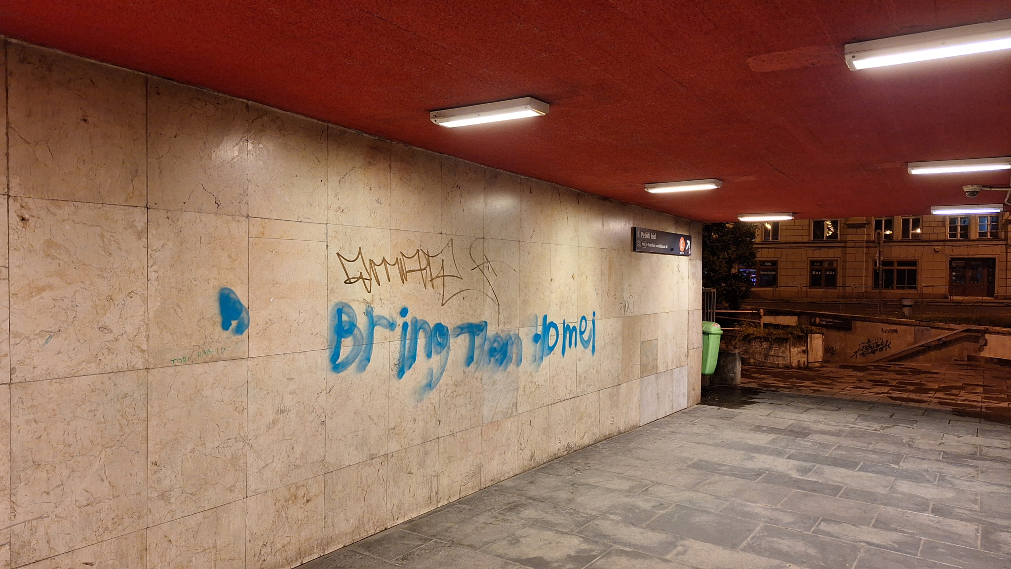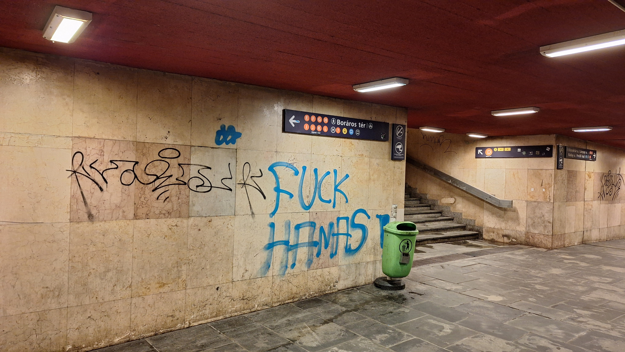 A Boráros téri aluljáró C és E kijárat közötti folyosója össze van firkálva.
