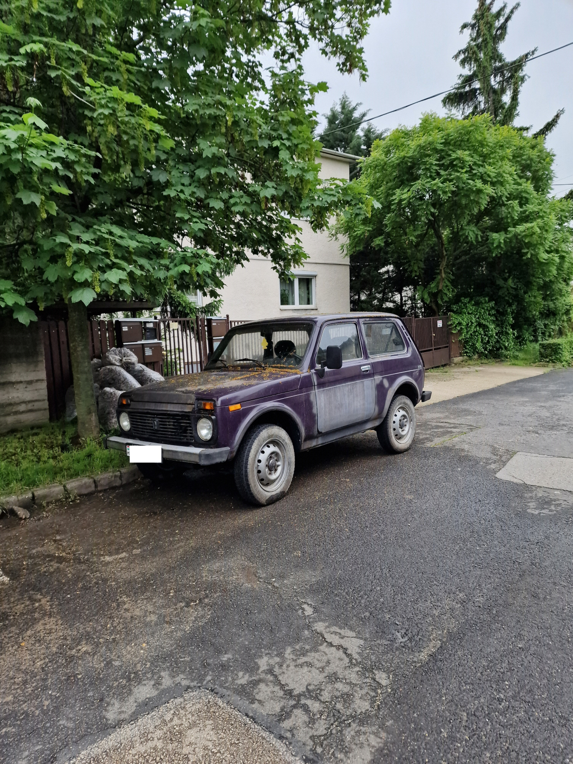 2000-es bíbor Lada Niva várakozik a 1118 Budapest, Bakony utca 20. előtt, műszakija 2024.03.21-ig volt érvényes.