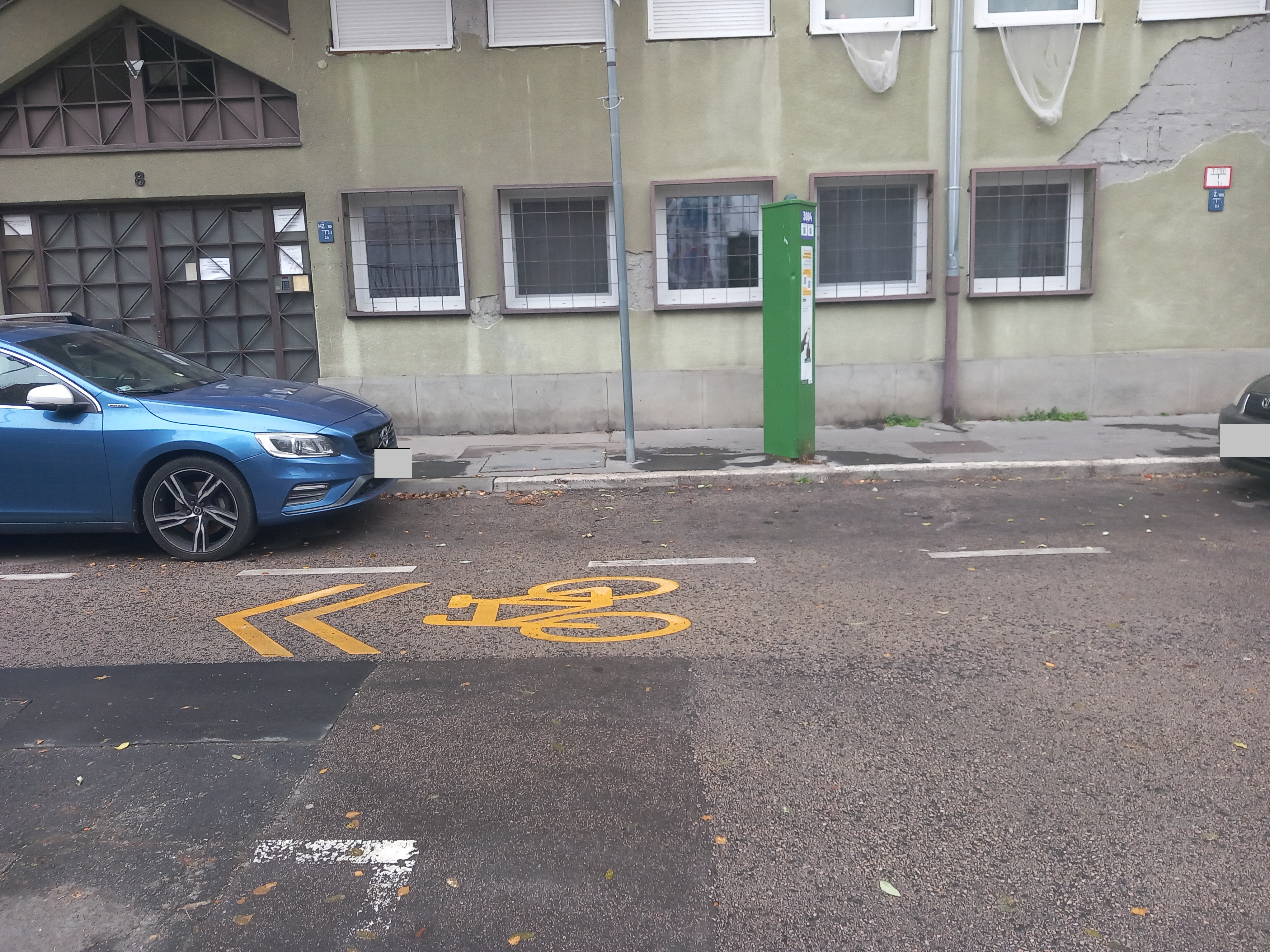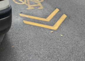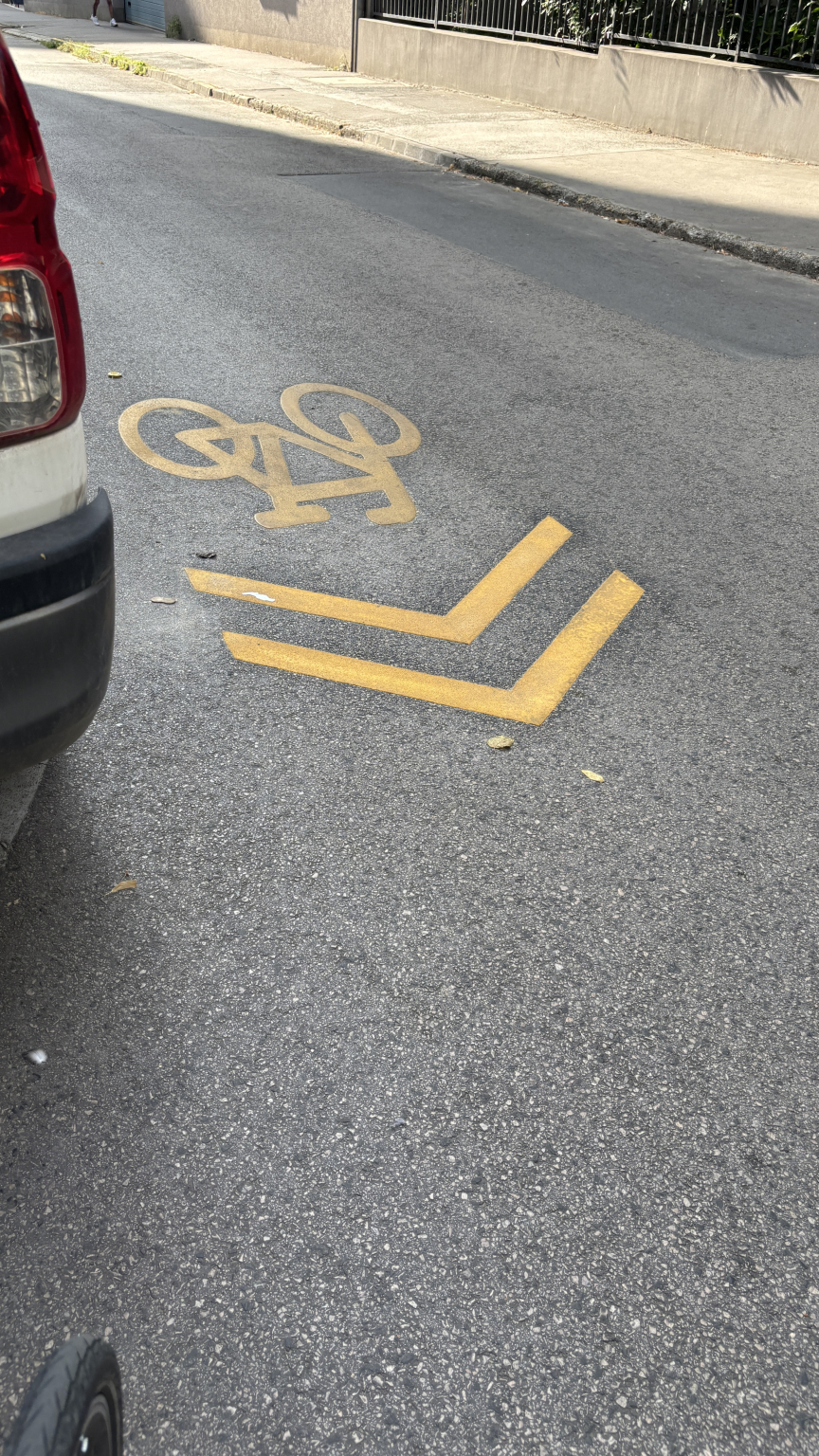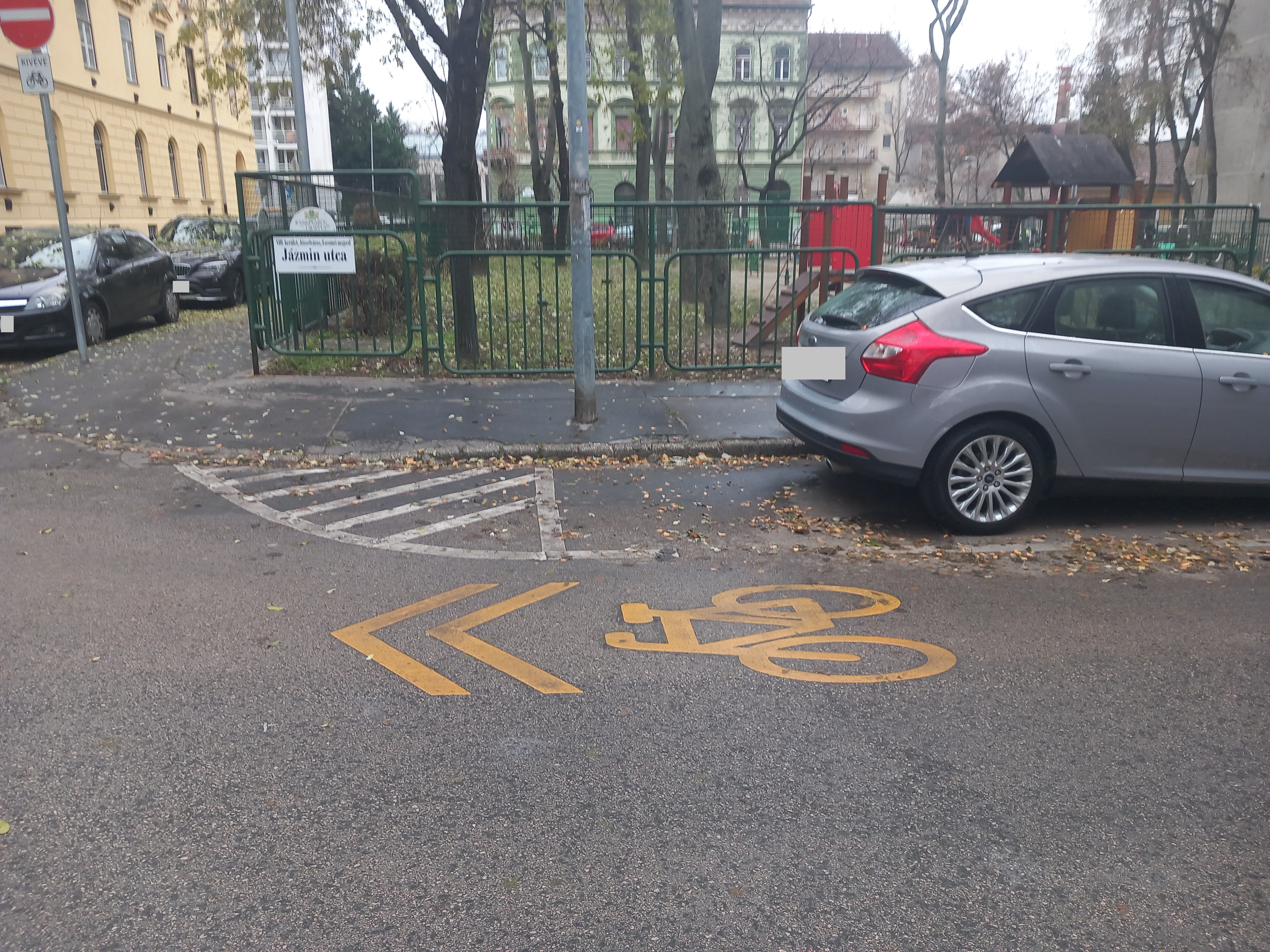 Hozzávetőleg 1 hónapos, kerékpárnyom felfestés lekopott a Jázmin utcában.
