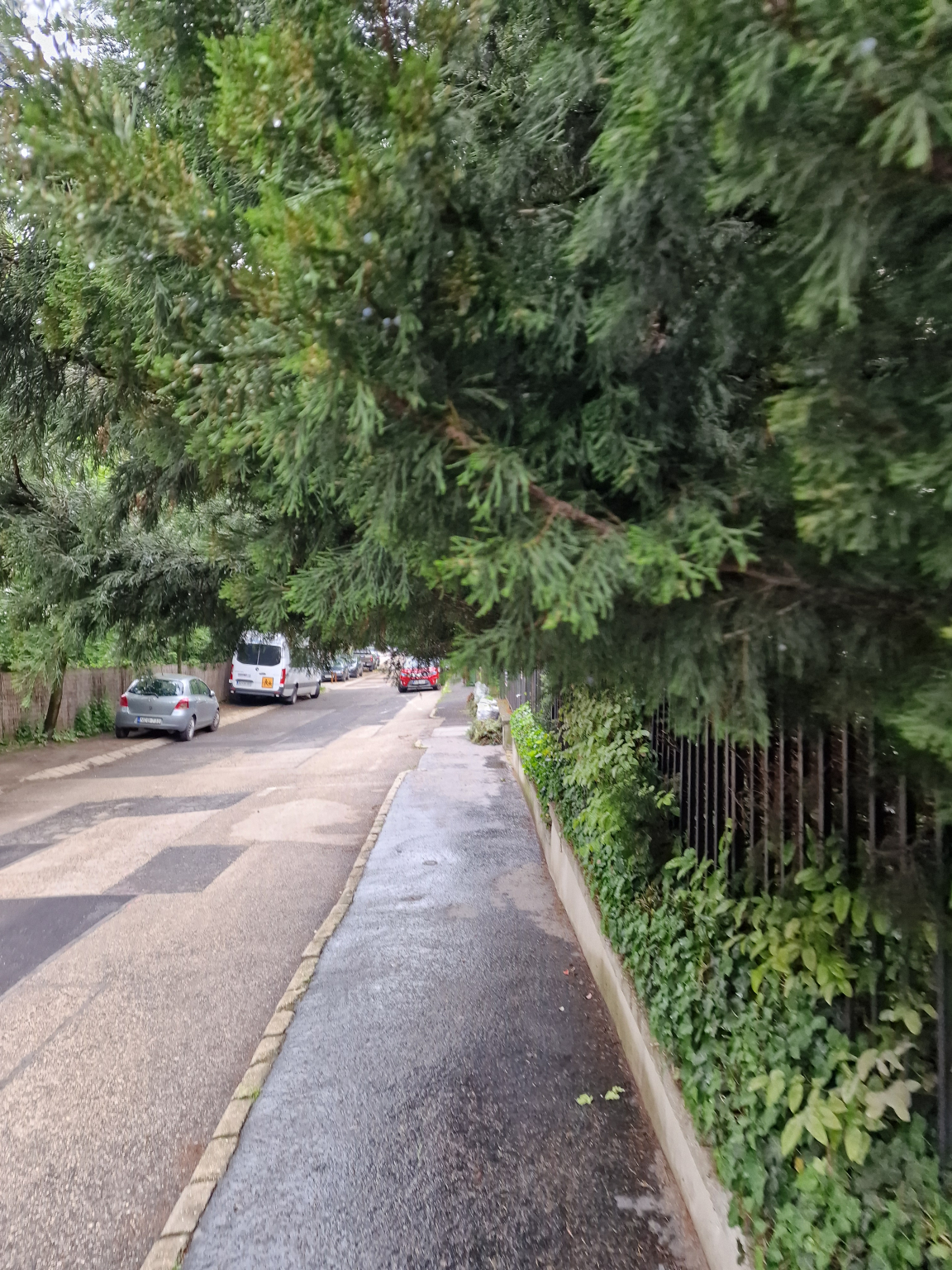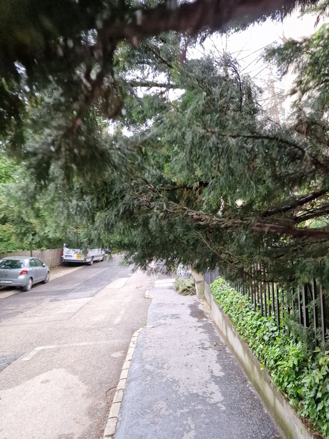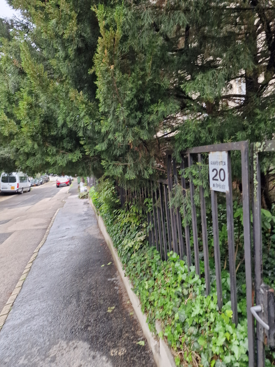 A Rahó utca 20. előtt nem lehet a járdán közlekedni a belógó faágak miatt 160 cm magasság felett.