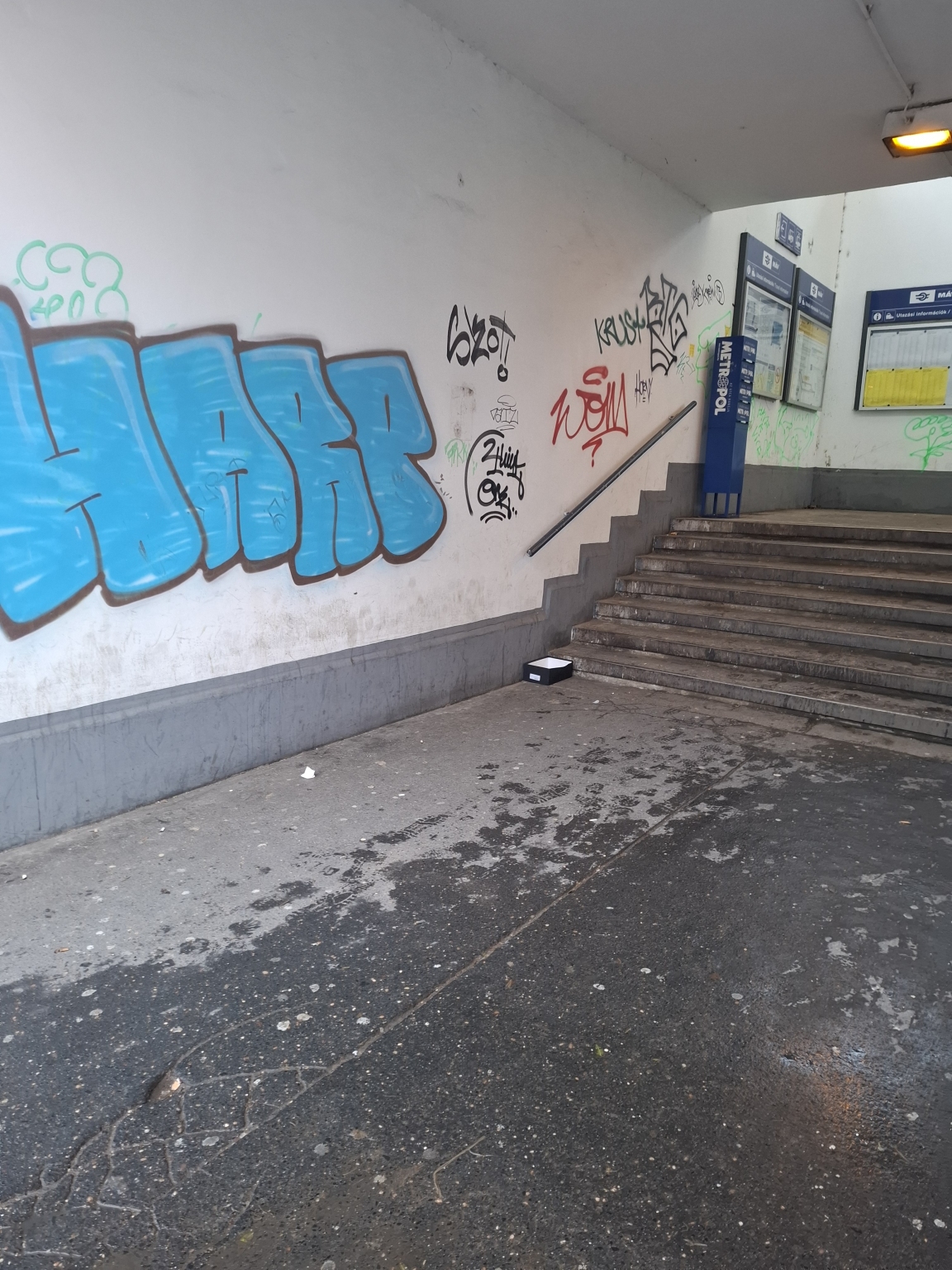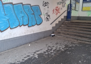 Vasútállomás lépcsője melletti fal teljes felülete graffitivel szennyezett. A képen csak egy kis része látható. Több kép a nagy tömeg miatt nem készült.