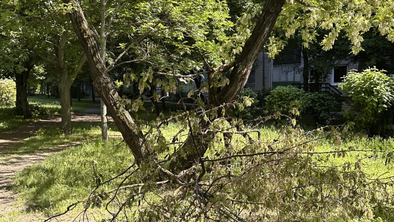 Budapest 10. kerület Gyakorló utca 4. / C háta mögött és az Árkád hátsó oldala között a házakhoz közelebbi részen egy nagy akác fáról egy nagyobb ág letört és a földön hever napok óta.