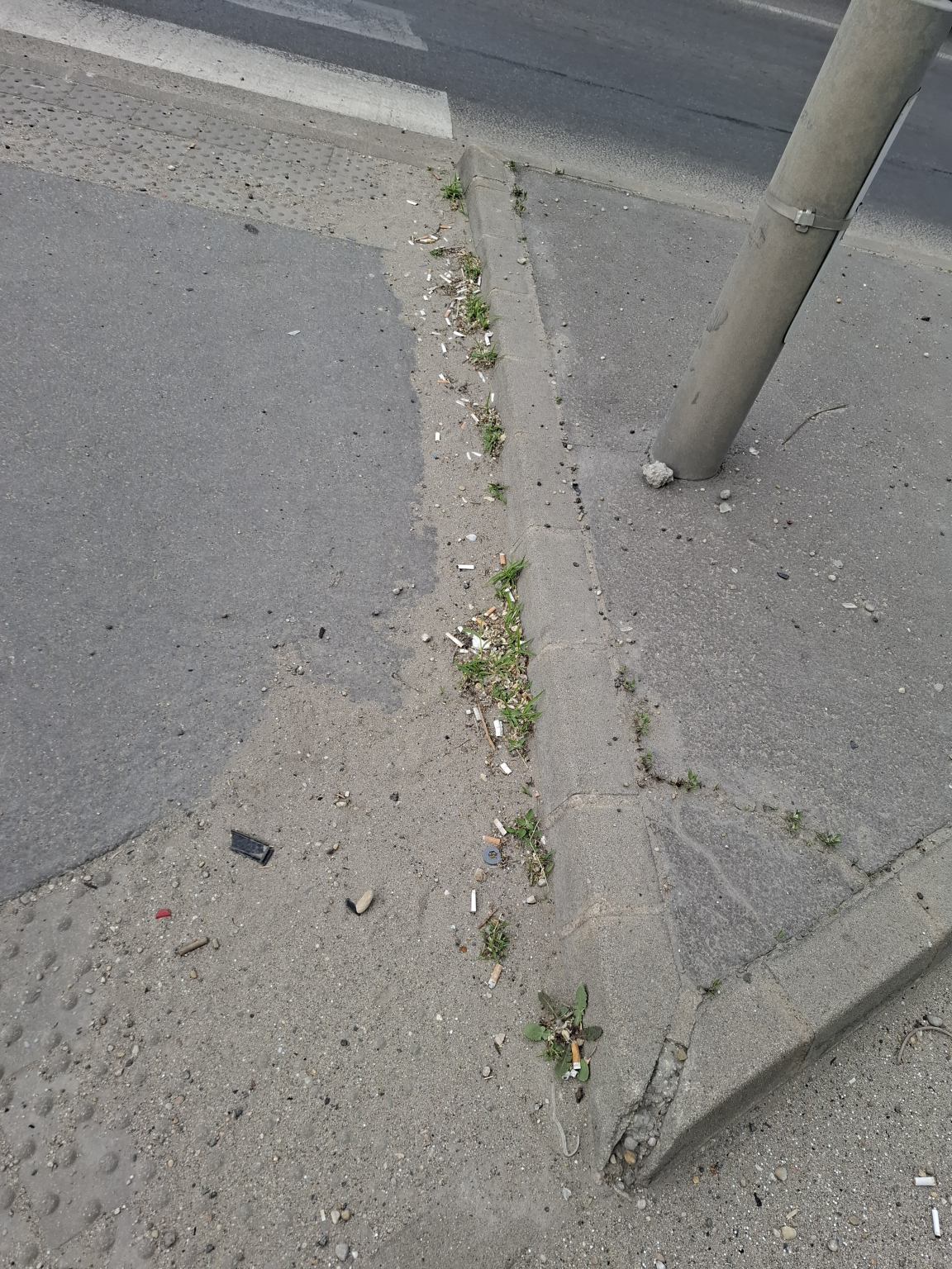 A gyalogátkelő és környezete teljes hosszában sok csikk, szemét van eldobálva, illetve az útról felverődő por, kavics.