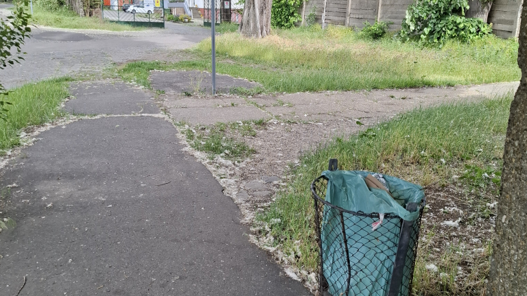 A Ferencváros vasútállomás felett átívelő gyalogos híd előtt, de még a járda szélén (Nem MÁV területen) a régi fémhálós kuka alja kiszakadt, a zsák kilóg belőle.